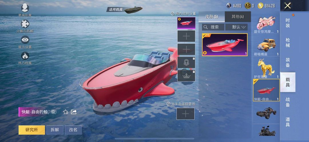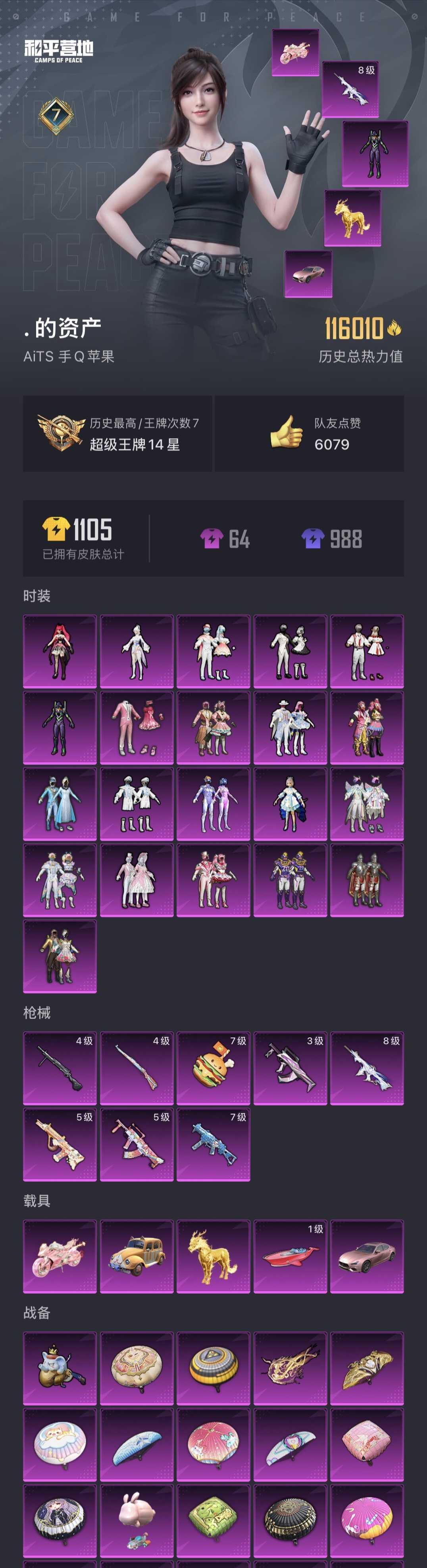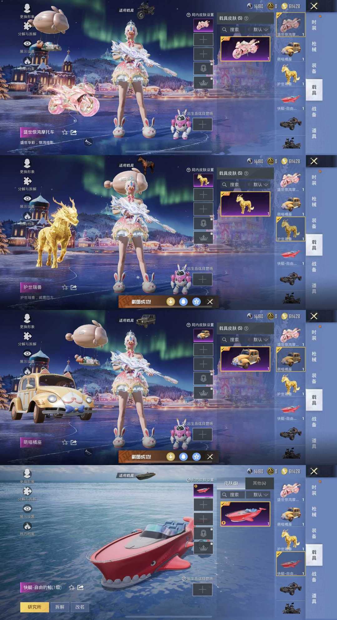 极品女神号/8级女娲灵识/21粉装新101雪国/8特效枪满级汉堡手雷/5车皮金麒麟玛莎拉蒂快艇僚机皮