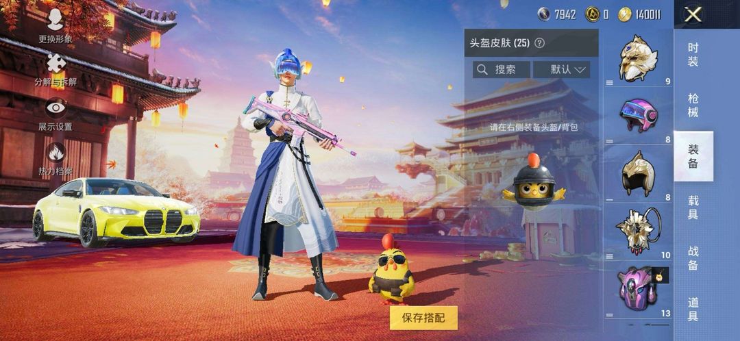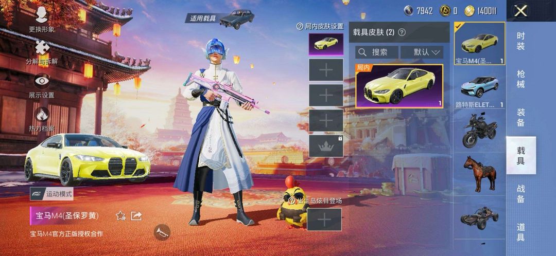装备描述:1粉,2载具,44套装,8王牌印记 SCAR-L-梦幻火箭/Kar98K-巳巳如意/路特斯ELETRE(冰川蓝)/宝马M4(圣保罗黄)/