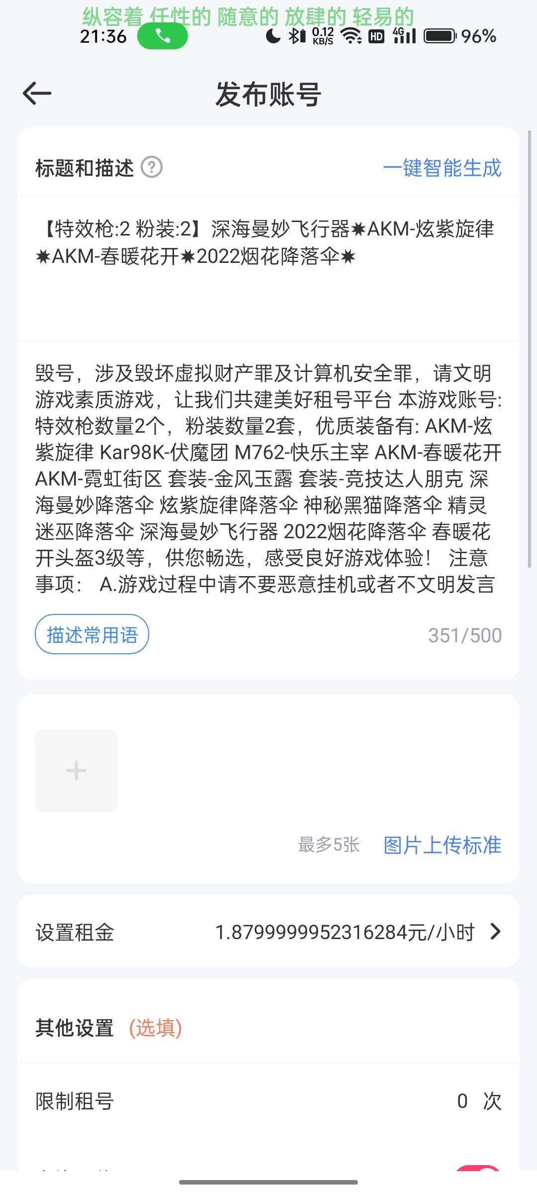 装备描述:毁号,涉及毁坏虚拟财产罪及计算机安全罪,请文明游戏素质游戏,让我们共建美好租号平台 本游戏账号:特效枪数量2个,粉装数量2套,优质装备有: AKM-炫紫旋律 Kar98K-伏魔团 M762-快乐主宰 AKM-春暖花开 AKM-霓虹街区 套装-金风玉露 套装-竞技达人朋克 深海曼妙降落伞 炫紫旋律降落伞 神秘黑猫降落伞 精灵迷巫降落伞 深海曼妙飞行器 2022烟花降落伞 春暖花开头盔3级等,供您畅选,感受良好游戏体验! 注意事项: A.游戏过程中请不要恶意挂机或者不文明发言 B.恶意挂机、顶号等行为将被拉黑无法再次下单 C.进入游戏后中途请勿退出登陆,否则无法再次上号 D.部分账号由于异地登录可能会出现密码错误提示,通常再尝试5-6次后可上号 喜欢本账号请点 ☆收藏☆ 方便下次租用,谢谢光临惠顾
