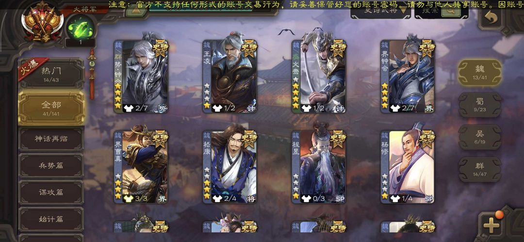 装备描述:◆曹髦谋关羽界徐盛◆双形态司马昭◆双形态文鸯界钟会◆回廊神太史慈◆动态歌王祢衡◆星黄忠星甘宁新回廊王元姬典藏界蔡文姬◆白马神赵云动态南华老仙 毁号行为涉及毁坏虚拟财产罪及计算机安全罪,请文明游戏素质游戏,让我们共建美好租号平台! 双形态势力钟