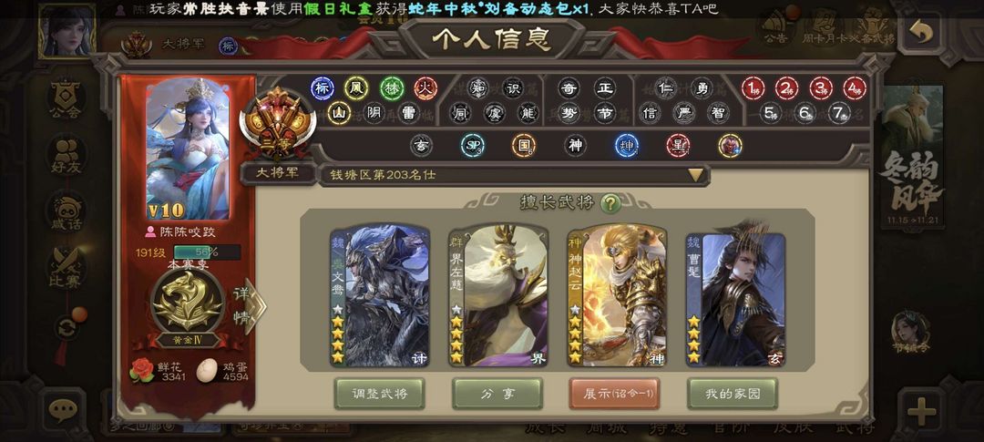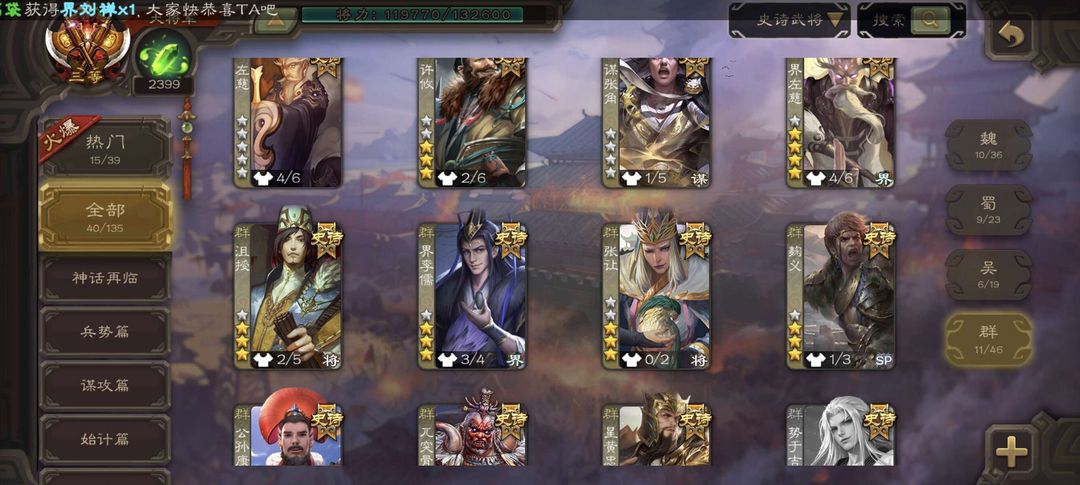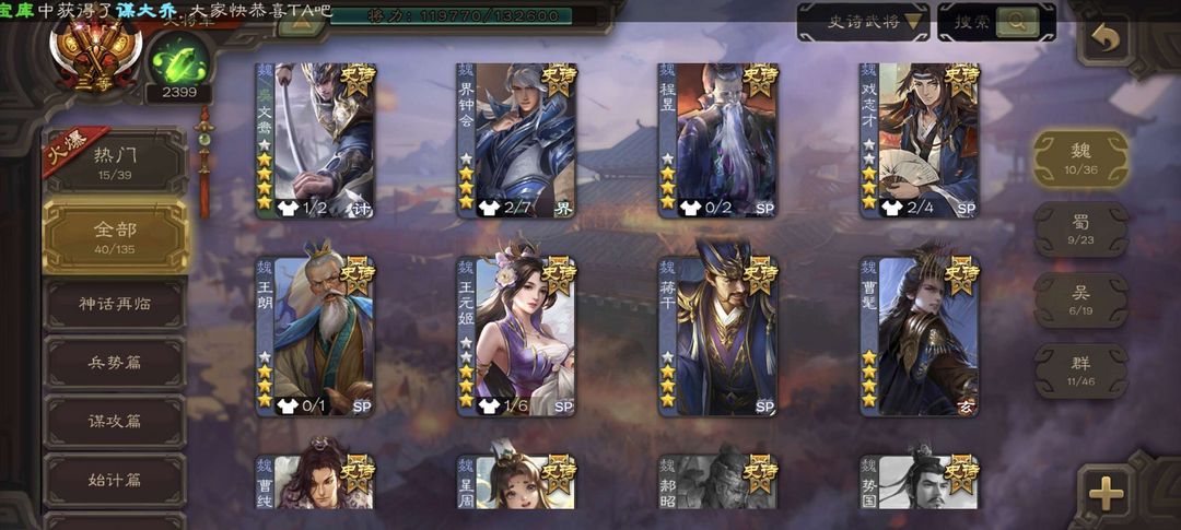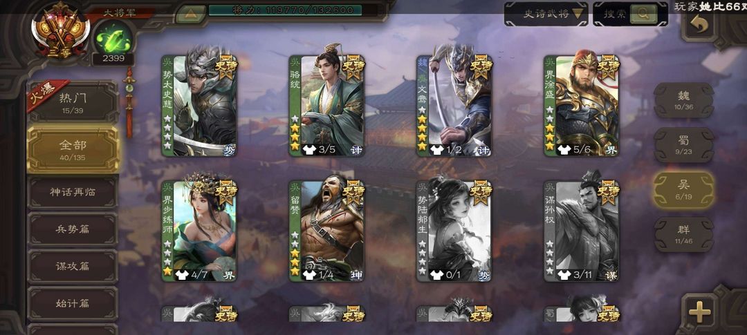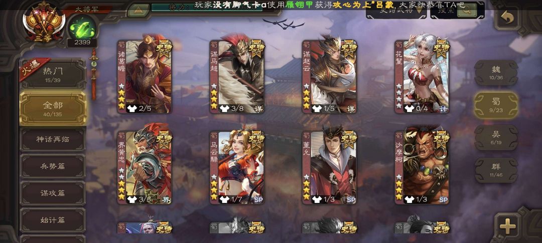 装备描述:曹髦,文鸯,势太,大宝,界钟会,骆统,白马,许攸,界左慈,神孙策,张让,等多史诗武将,多动态皮肤,三卡齐全,严禁逃跑,查到拉黑