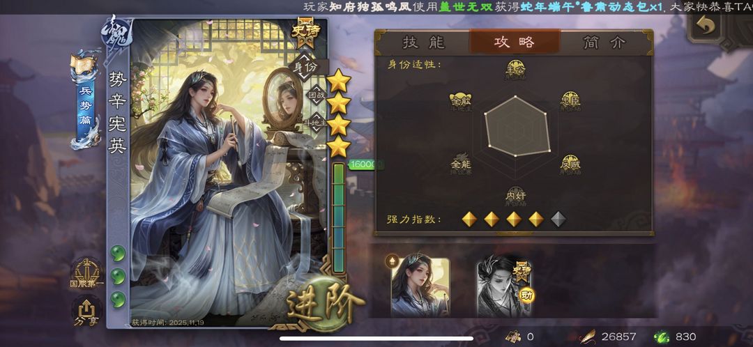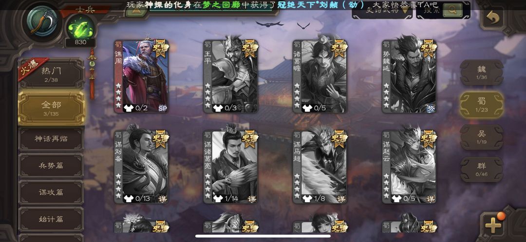限制: 撤单率<1%才可租用此帐号装备描述:新品尝鲜有卡势辛宪英/低官阶炸鱼号/界徐盛/谯周三卡足带万豆子