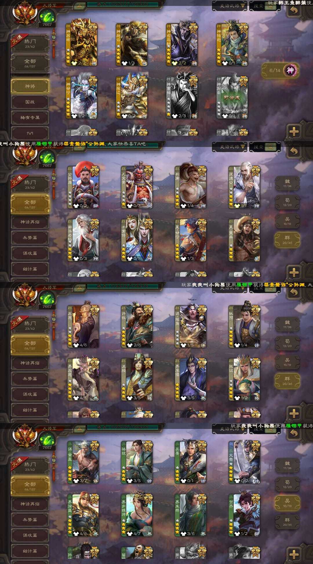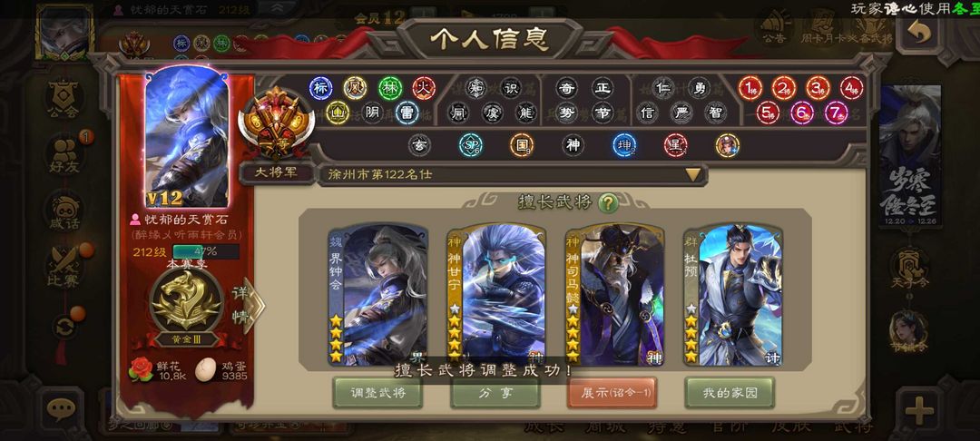 装备描述:魏国⚡郝昭⚡文鸯⚡界于禁⚡界钟会⚡界曹真⚡嵇康⚡程昱⚡戏志才⚡杨修⚡陈琳⚡曹婴⚡王元姬⚡羊徽瑜⚡SP司马昭⚡曹纯⚡马钧⚡星周不疑⚡ 蜀国⚡诸葛瞻⚡谋马超⚡谋赵云⚡花鬘⚡界黄忠⚡马云騄⚡张星彩⚡董允⚡赵襄⚡关索⚡沙摩柯⚡谯周⚡ 吴国⚡谋黄盖⚡骆统⚡吴景⚡界徐盛⚡界步练师⚡界朱然⚡贺齐⚡孙皓⚡留赞⚡ 群雄⚡左慈⚡许攸⚡谋张角⚡杜预⚡界左慈⚡沮授⚡界李儒⚡张让⚡麴义⚡司马徽⚡苏飞⚡张琪瑛⚡公孙康⚡兀突骨⚡祢衡⚡庞德公⚡南华老仙⚡十常侍⚡星甘宁⚡星董卓⚡ 神将⚡神关羽⚡神吕蒙⚡神周瑜⚡神吕布⚡神赵云⚡神司马懿⚡神陆逊⚡神甘宁⚡神张辽⚡ 排位133 国战102 冠绝天下·神吕布 战龙在野·神赵云 鉴往知来·神司马懿 万人辟易·神甘宁 潜蛟觊天·钟会 锋芒毕露·曹婴 鼠年冬至·王元姬 破军杀将·徐盛 火烧乌巢·许攸 龙吟破竹·杜预 鸠杀少帝·李儒 超脱于世·庞德公
