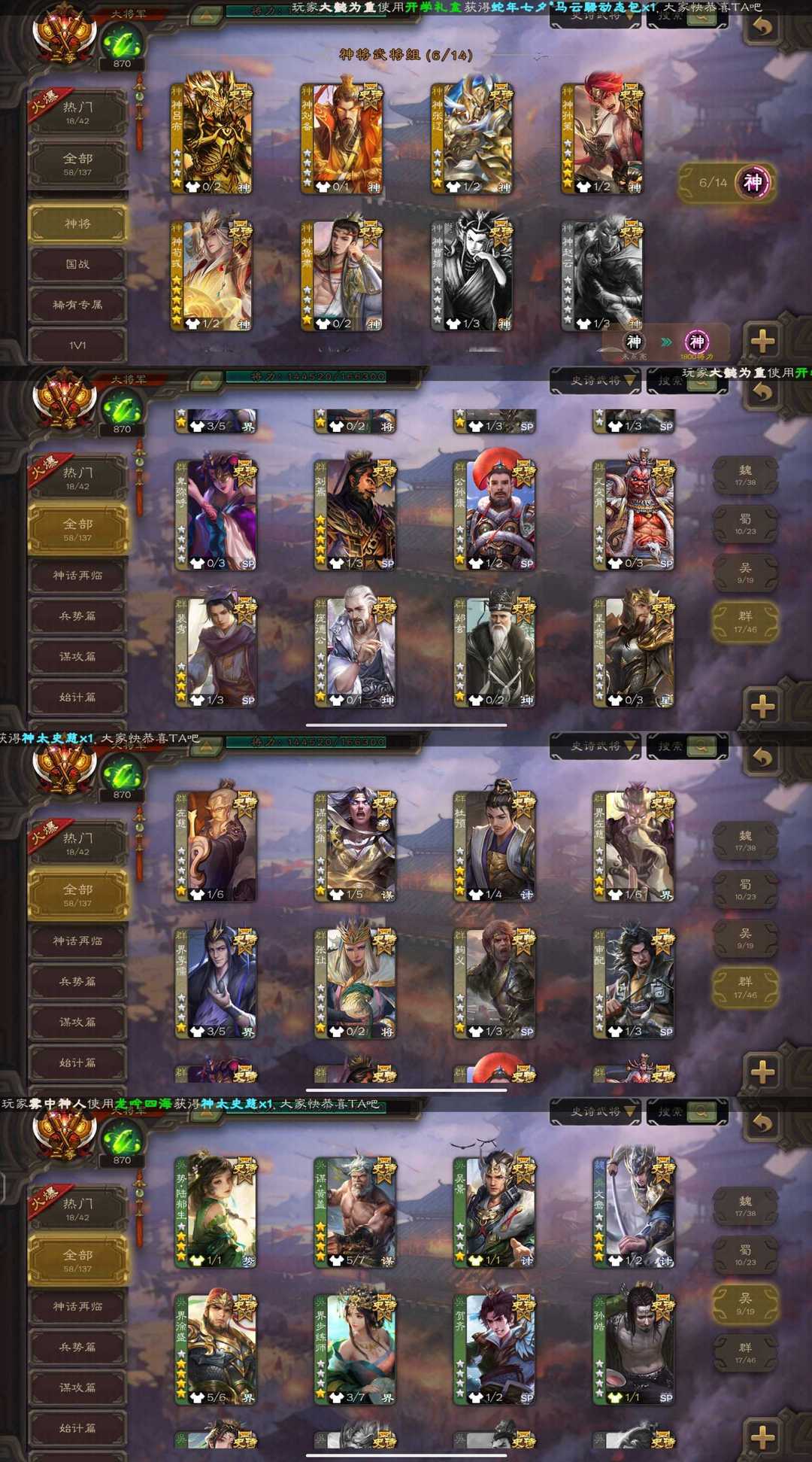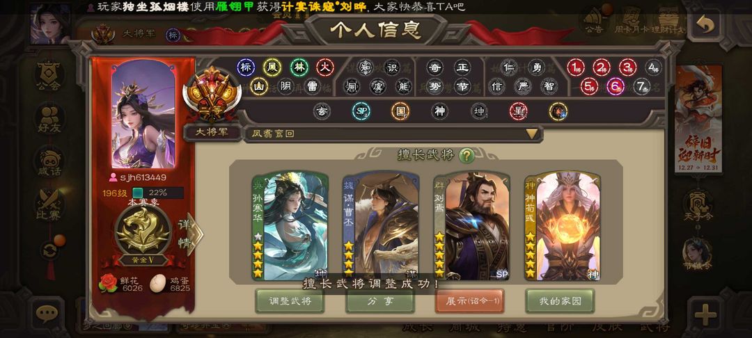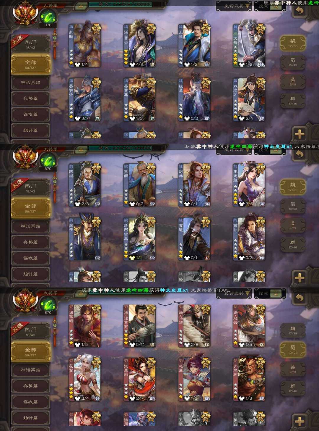 装备描述:魏国:⚡郝昭⚡谋曹丕⚡王粲⚡⚡文鸯⚡界钟会⚡界曹真⚡程昱⚡戏志才⚡陈琳⚡王朗⚡刘晔⚡王元姬⚡蒋干⚡清河公主⚡曹髦⚡曹纯⚡星周不疑⚡ 蜀国:⚡诸葛瞻⚡谋诸葛亮⚡谋马超⚡谋赵云⚡花鬘⚡⚡张星彩⚡赵襄⚡沙摩柯⚡鲍三娘⚡谯周⚡ 吴国:⚡势陆郁生⚡谋黄盖⚡吴景⚡文鸯⚡界徐盛⚡界步练师⚡贺齐⚡孙皓⚡孙寒华⚡ 群雄:⚡左慈⚡谋张角⚡⚡杜预⚡界左慈⚡界李儒⚡张让⚡麴义⚡审配⚡卑弥呼⚡刘焉⚡公孙康⚡兀突骨⚡裴秀⚡庞德公⚡郑玄⚡星黄忠⚡星董卓⚡ 神将:⚡神吕布⚡神刘备⚡神张辽⚡神孙策⚡神荀彧⚡神鲁肃⚡ 排位:150 国战:39 气荡山河-曹丕 势若万钧-文鸯 举棋若定-戏志才 婆娑起舞-王元姬 鼠年冬至-王元姬 沙场蛮花-花鬘 以身证道-黄盖 破军杀将-徐盛 威灵尽显-孙寒华 龙吟破竹-杜预 鸠杀少帝-李儒 雄踞益州-刘焉 匡汉延祚-神荀彧 霸王在世-神孙策