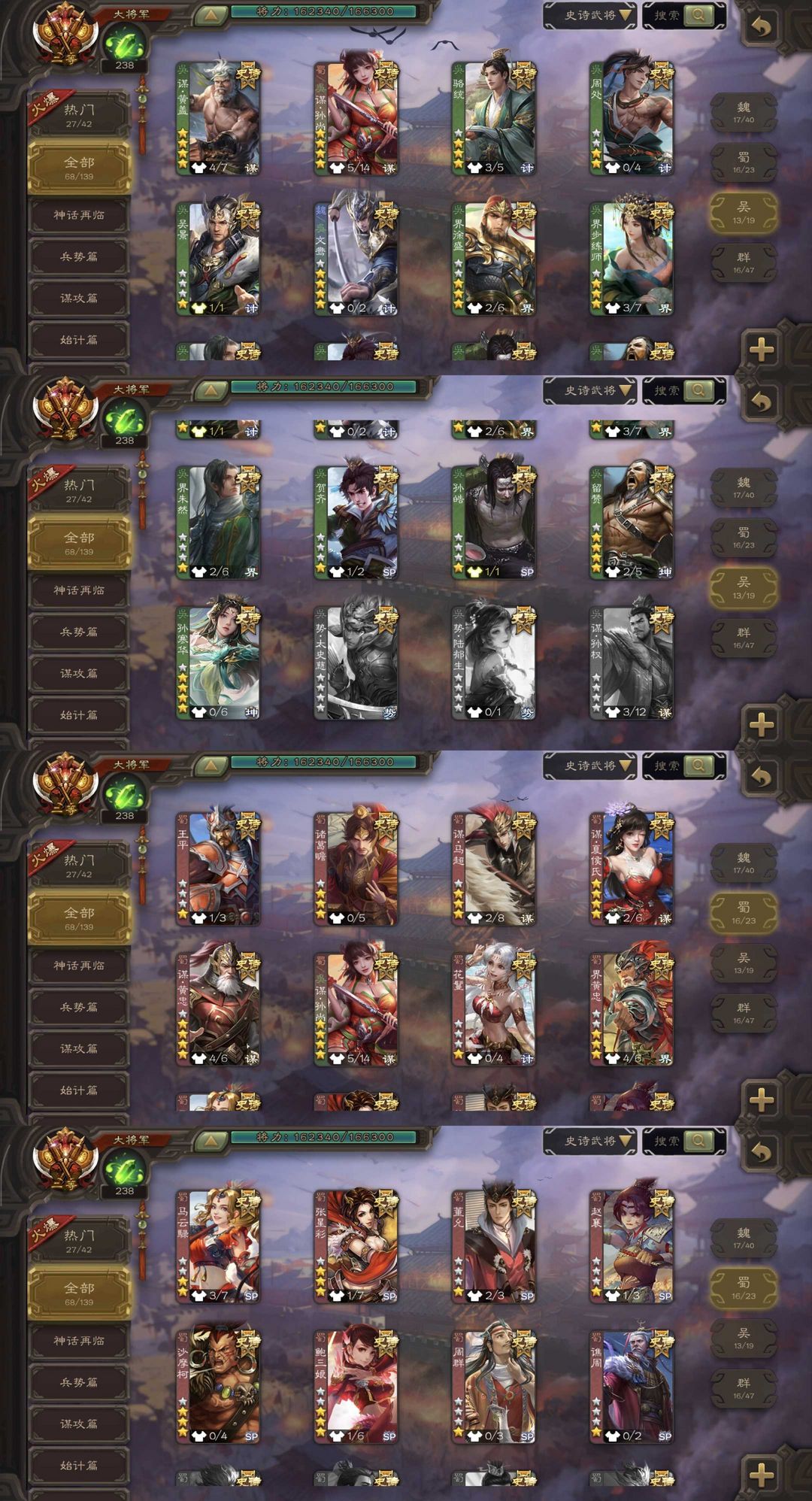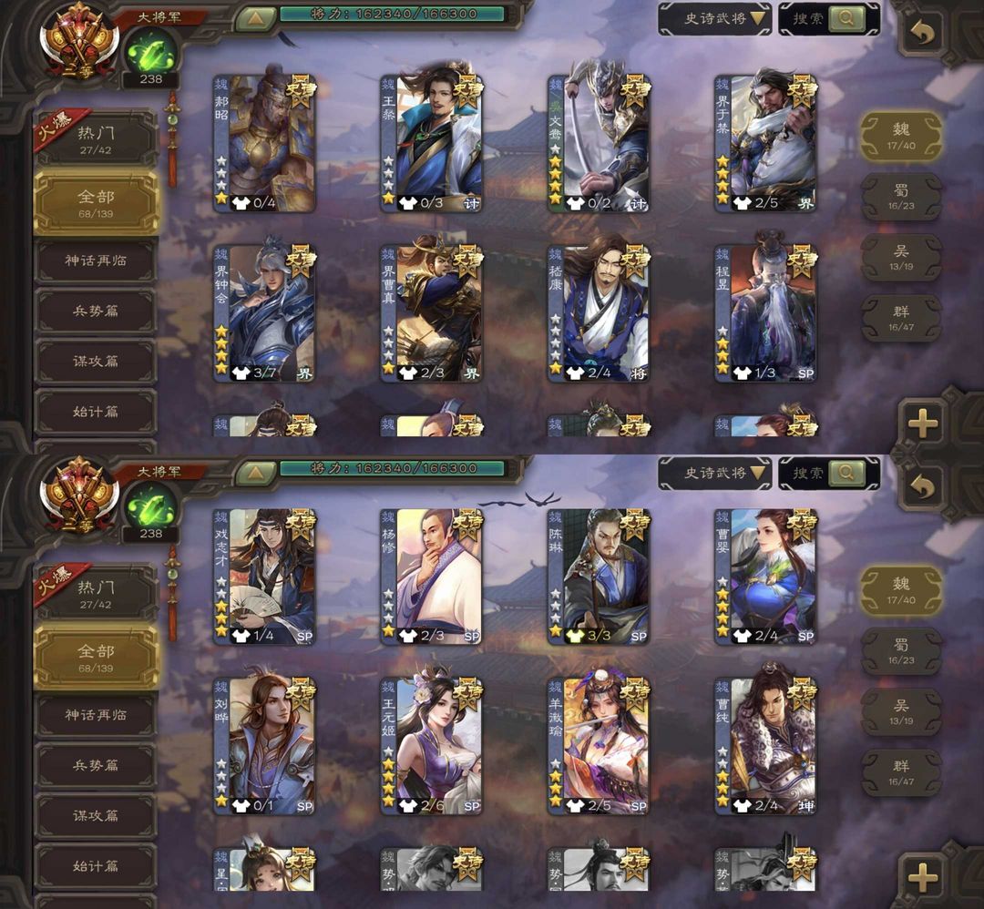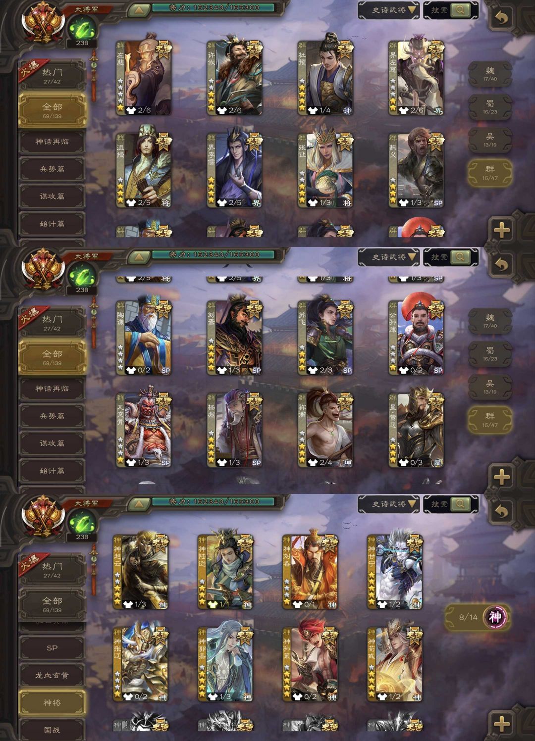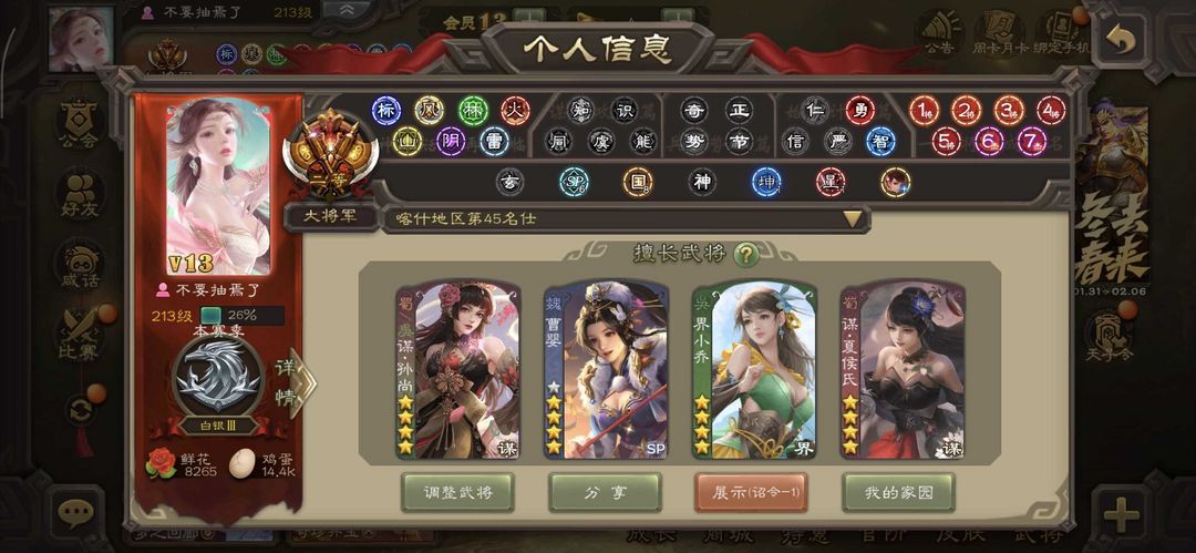 装备描述:二等大将军 VIP13 总数426 史诗68 动态皮肤59 魏国⚡郝昭⚡王粲⚡文鸯⚡界于禁⚡界钟会⚡界曹真⚡嵇康⚡程昱⚡戏志才⚡杨修⚡陈琳⚡曹婴⚡刘晔⚡王元姬⚡羊徽瑜⚡曹纯⚡星周不疑⚡ 蜀国⚡王平⚡诸葛瞻⚡谋马超⚡谋夏侯氏⚡谋黄忠⚡谋孙尚香⚡花鬘⚡界黄忠⚡马云騄⚡张星彩⚡董允⚡赵襄⚡沙摩柯⚡鲍三娘⚡周群⚡谯周⚡ 吴国⚡谋黄盖⚡谋孙尚香⚡骆统⚡周处⚡吴景⚡文鸯⚡界徐盛⚡界步练师⚡界朱然⚡贺齐⚡孙皓⚡留赞⚡孙寒华⚡ 群雄⚡左慈⚡许攸⚡杜预⚡界左慈⚡沮授⚡界李儒⚡张让⚡麹义⚡陶谦⚡刘焉⚡苏飞⚡公孙康⚡兀突骨⚡杨彪⚡祢衡⚡星黄忠⚡ 神将⚡神赵云⚡神陆逊⚡神刘备⚡神甘宁⚡神张辽⚡神郭嘉⚡神孙策⚡神荀彧⚡ 排位112 国战95 锋芒毕露-曹婴 鼠年冬至-王元姬 明良千古-夏侯氏 明良千古-孙尚香 抗音而歌-留赞 灵魂歌王-留赞 鸠杀少帝-李儒 雄踞益州-刘焉 击鼓骂曹-祢衡 万人辟易-神甘宁 绽焰摧枯-神陆逊 战龙在野-神赵云