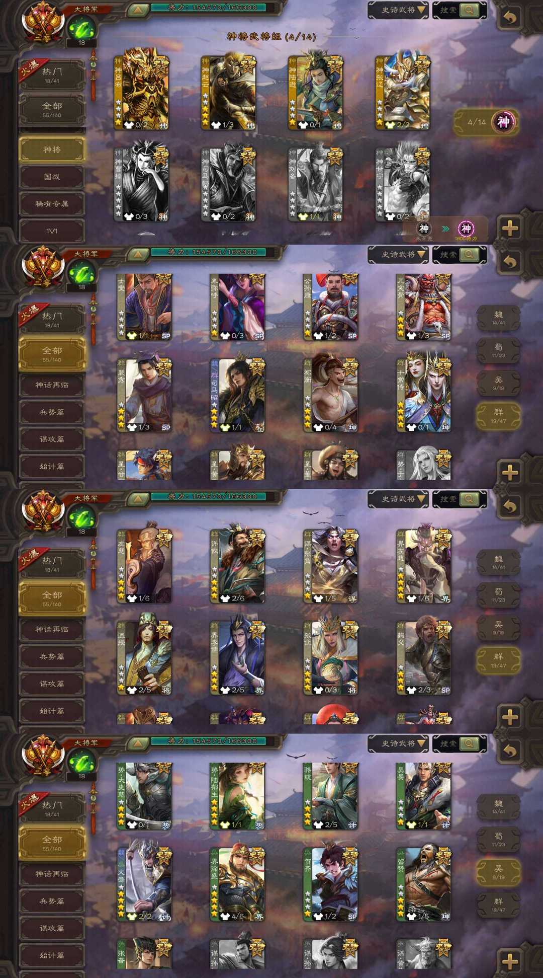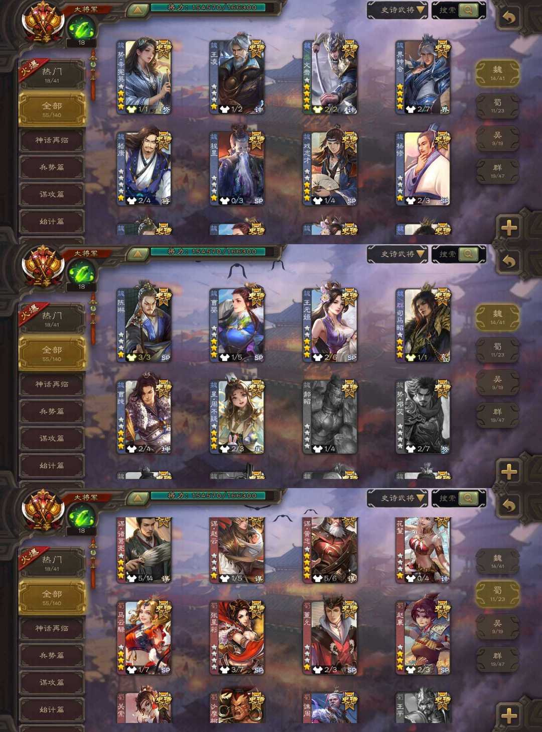 装备描述:二等大将军 VIP11 武将总数420 史诗武将54 动态皮肤61 史诗宝珠28.5 心愿积分18955 雁翎3204 将魂6127 魏国武将⚡势辛宪英⚡王凌⚡文鸯⚡界钟会⚡嵇康⚡程昱⚡戏志才⚡杨修⚡陈琳⚡曹婴⚡王元姬⚡司马昭⚡曹纯⚡星周不疑⚡ 蜀国武将⚡谋诸葛亮⚡谋赵云⚡谋黄忠⚡花鬘⚡马云騄⚡张星彩⚡董允⚡赵襄⚡关索⚡沙摩柯⚡谯周⚡ 吴国武将⚡势太史慈⚡势陆郁生⚡骆统⚡吴景⚡文鸯⚡界徐盛⚡贺齐⚡留赞⚡张奋⚡ 群雄武将⚡左慈⚡许攸⚡谋张角⚡界左慈⚡沮授⚡界李儒⚡张让⚡麴义⚡卑弥呼⚡公孙康⚡兀突骨⚡螃蟹⚡司马昭⚡祢衡⚡十常侍⚡星甘宁⚡星黄忠⚡星董卓⚡ 神将⚡神吕布⚡神赵云⚡神陆逊⚡神张辽⚡ 排位武将145 国战武将37 凤翥鸾回-势辛宪英 破宇开天-文鸯 势若万钧-文鸯 潜蛟觊天-钟会 火烧博望-卧龙诸葛 烈箭贯云-谋黄忠 临军对阵-张星彩 破军杀将-徐盛 灵魂歌王-留赞 道法显威-左慈 扬刀立威-麹义 鸠杀少帝-李儒