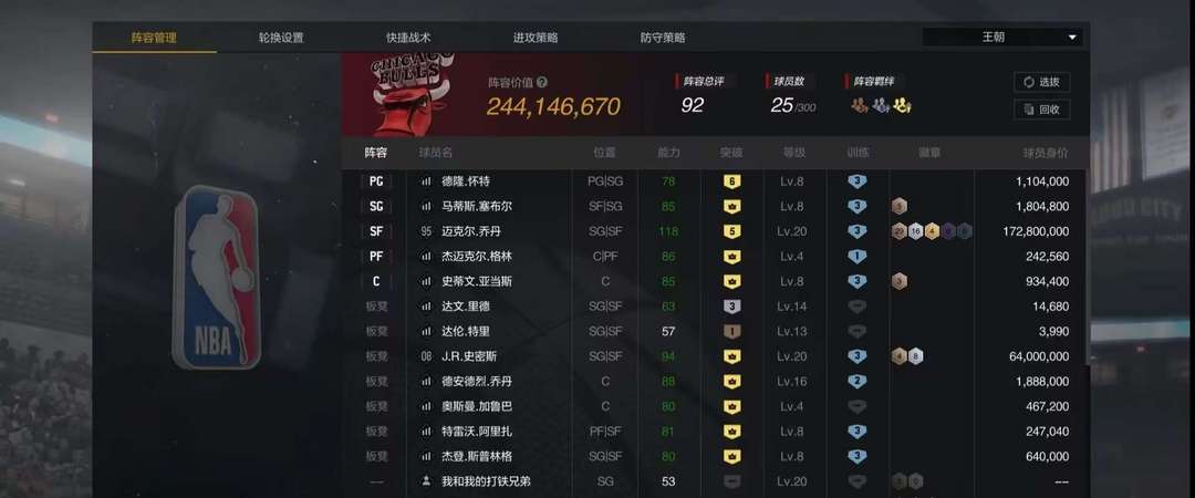 装备描述:5突95迈克尔乔丹满jr史密斯,满特训满羁绊,王朝段位:发展联盟 4外1内阵容低段位炸鱼 街头段位:巨星3 游戏中请避免消极时间快到时可玩自定义,非常感谢您的文明游戏。