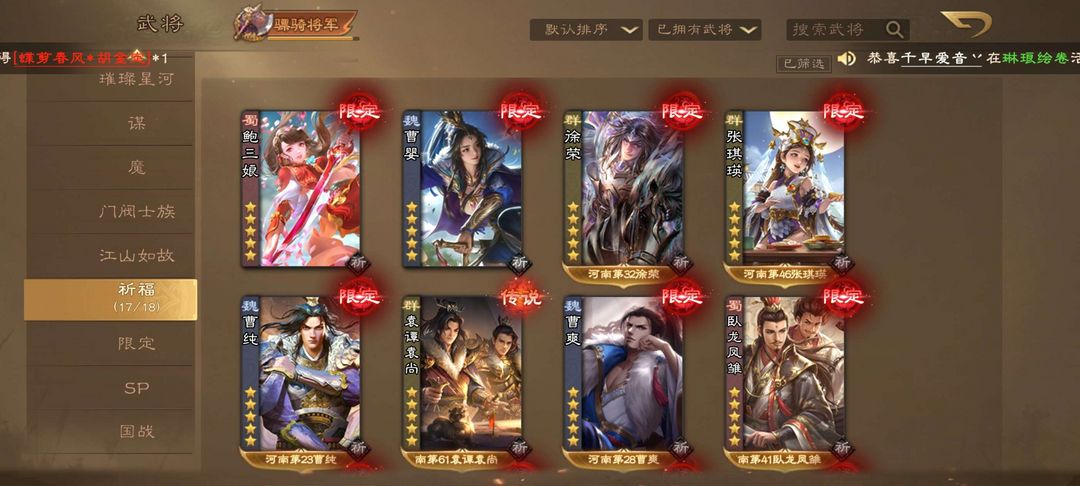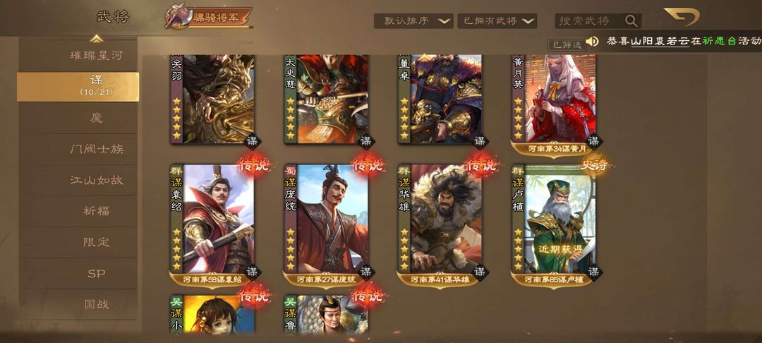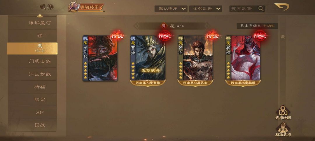 装备描述:20大18小 20大:吕玲绮 (动)魔曹操(绘卷) 魔貂蝉(绘卷) 郭照 (绘卷)薛灵芸 蒋琬(绘卷) 鲍三娘 (动) 潘淑 (动)冯方女(绘卷) 曹爽 周处(动) 曹纯 (动)徐荣 (动)曹宪曹华(绘卷) 卧龙凤雏 (动) 曹英 (动) 张琪瑛 (动)费祎 (绘卷) 袁谭袁尚 族钟啖 谋董卓 董小姐 族荀谌 族杨彪 族钟会 藤芳兰 界徐盛 吕伯奢 丙基 杨仪 王蓉 胡金定 丁原 羊枯 左芬 花蔓 杨婉 刘辩 翻翻乐 :张华 夏侯玄 神张角 蒲元 族荀谌 其他强将:闪刘宏 谋月英 司马徽 丁妈 谋小乔 谋鲁肃 谋华雄 谋关羽 谋袁绍 谋太史慈 族荀采 族王凌 族王允 sp曹操sp刘备 谋庞统 杜夫人 董昭 黄承彦 闪张辽 孔淑 谋卢植 族王沈