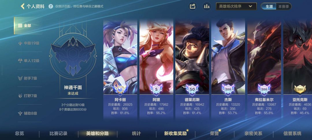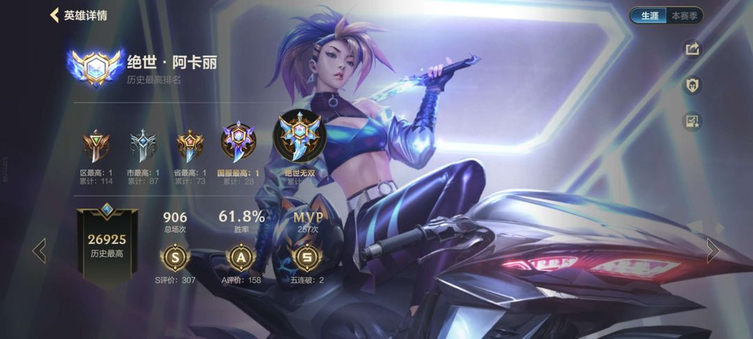 大师段位,历史国一绝世阿卡丽,国五阿狸,国服杰斯诺手吸血鬼,禁止挂机骂人