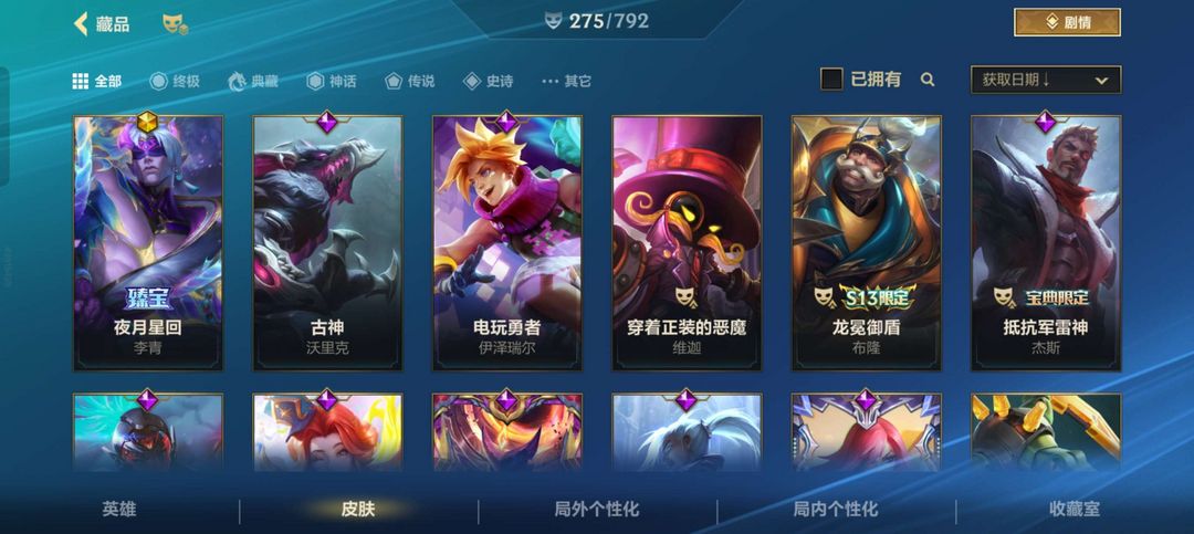 装备描述:Q区,满英雄,275个皮肤,不要消耗里面东西,消耗点券