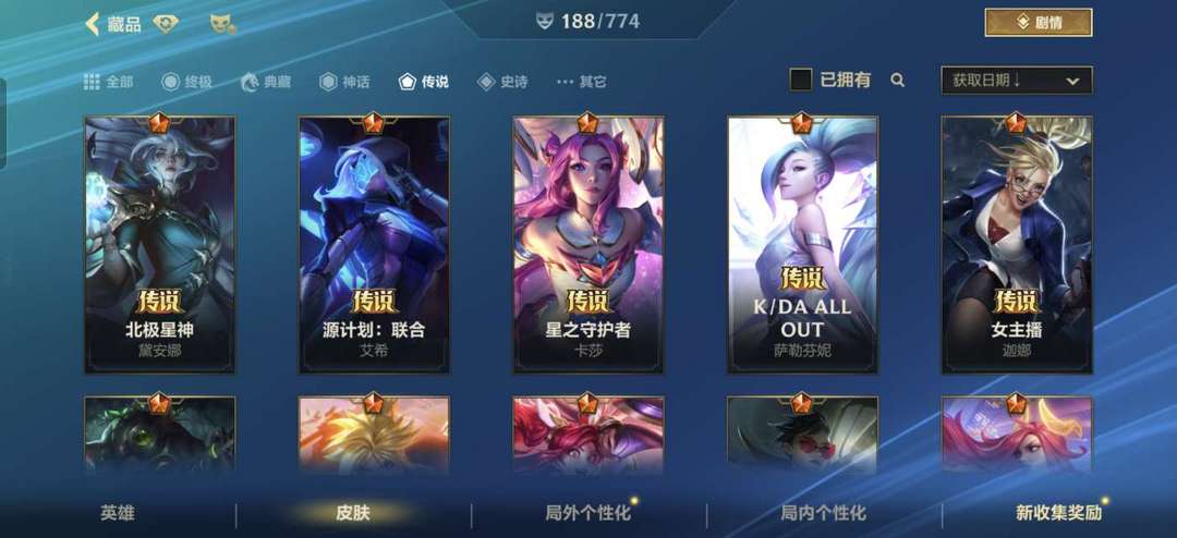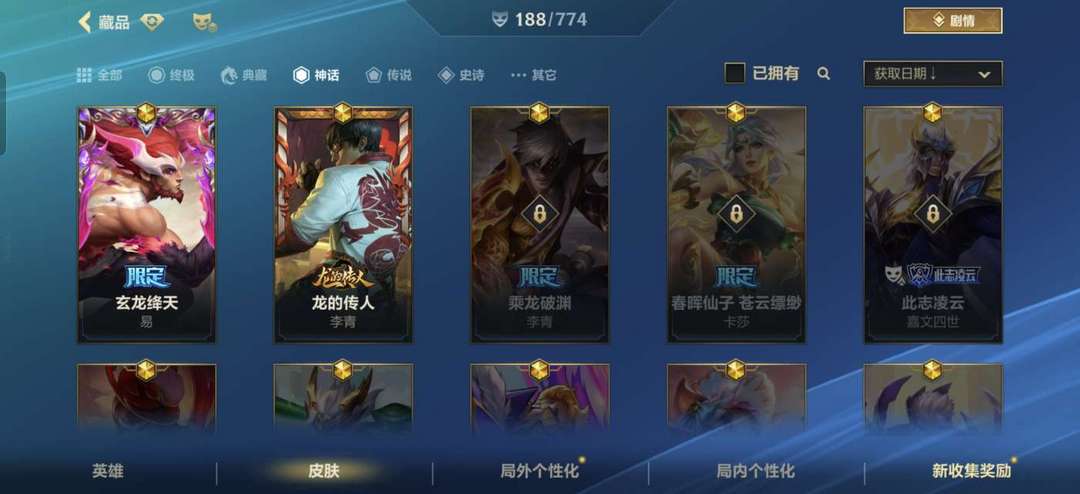 装备描述:本人自玩号,皮肤玩的都有,图里放不下,还有挺多史诗的一共180多个