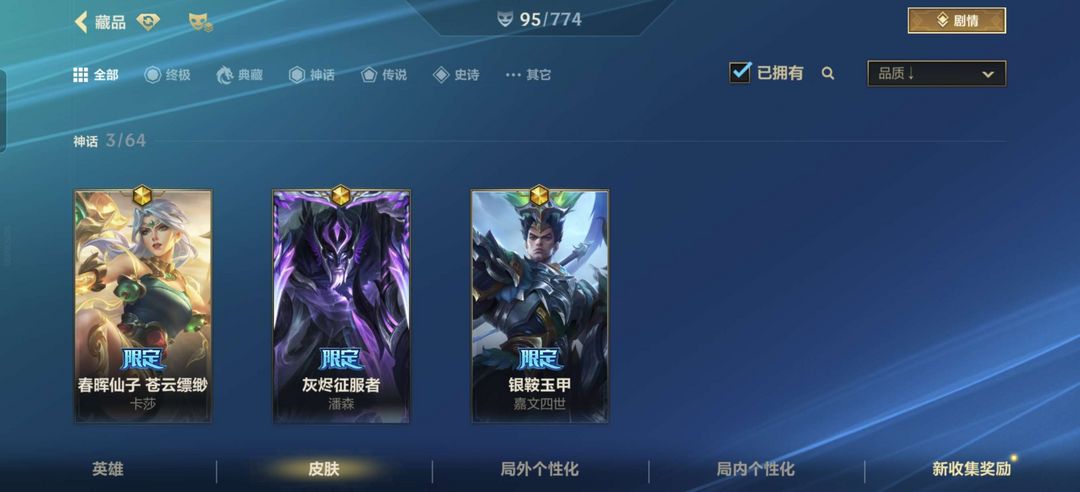 3 个神话皮,13 个传说皮,39 个史诗皮刀妹潘森几乎全皮