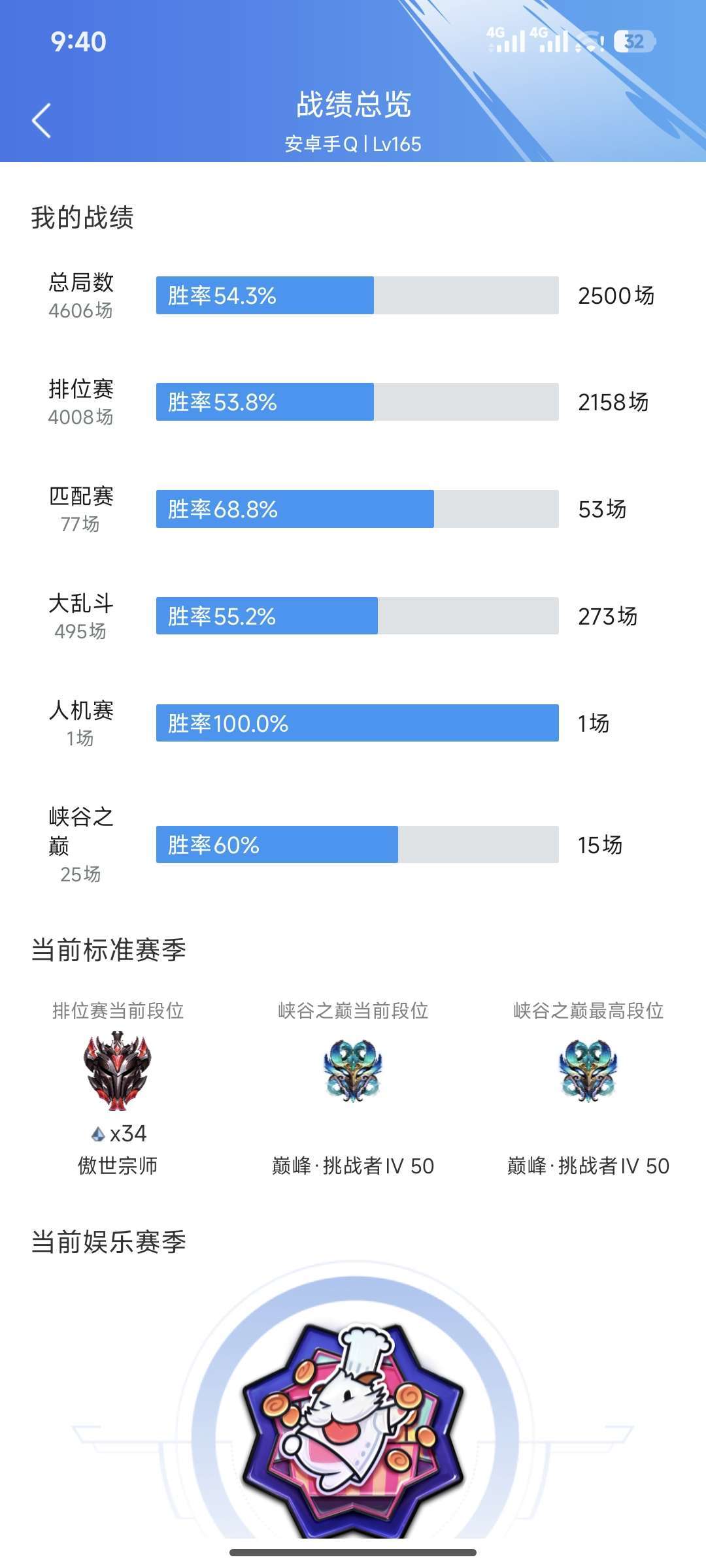宗师可排位全英雄15传说 40史诗宗师段 可接代陪基本上英雄都有皮肤