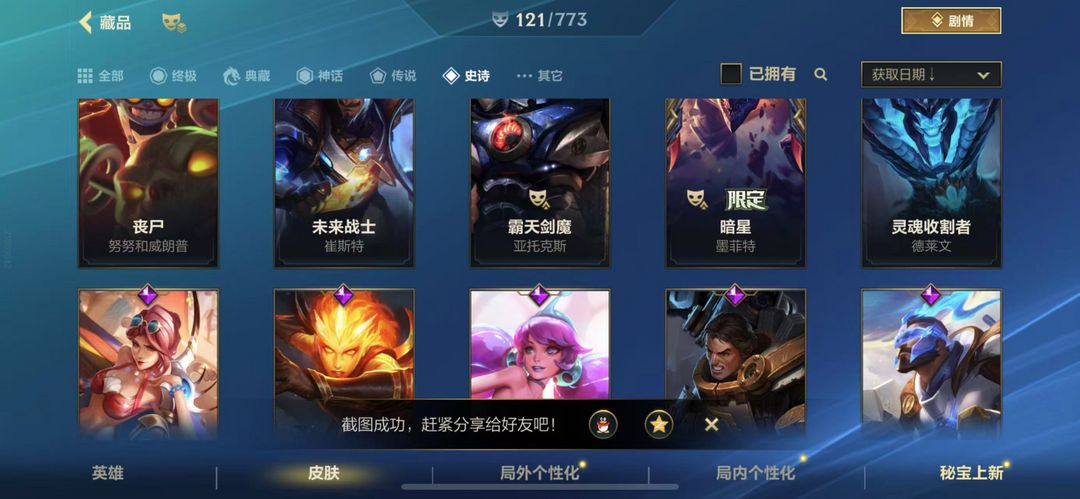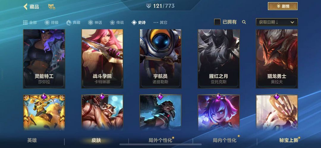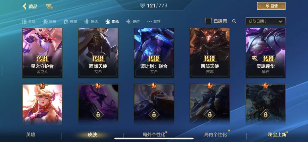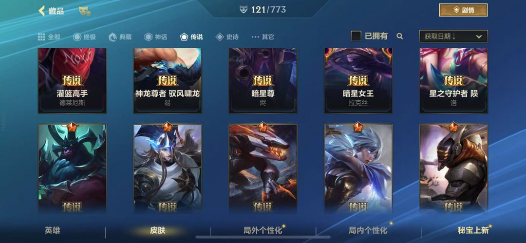 装备描述:121皮肤1至臻16传说46史诗可排位可加好友