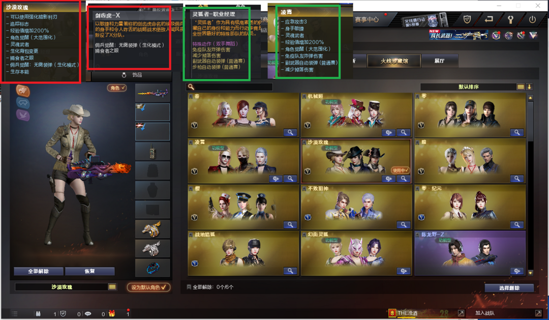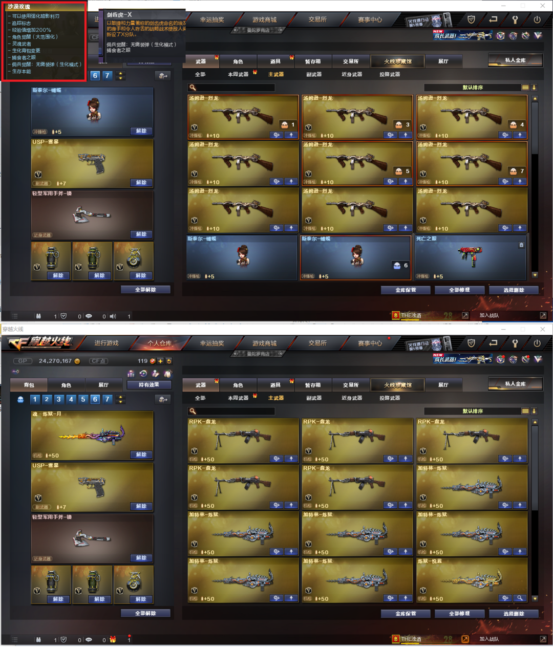 装备描述:排位:可以、、、、、、、、生化四防:(可以变更背包、查看生化僵尸血量):无需换弹、6烈龙、6盘龙、1炼狱、斯泰尔蝴蝶、死亡之眼、手斧镜、全部弹匣、、、、、爆破四防:幻神、3个USP雷暴、2个COP堕天神、加利尔ACE-天香、QBZ金色蔷薇、QBZ天罚、、、毁灭音效、雷神音效、黑骑士音效、、、12套雷暴、7套夜魔、7套电竞装甲、、、生化四防(沙漠玫瑰、剑齿虎)、爆破四防(凌霄、机械姬、职业经理)