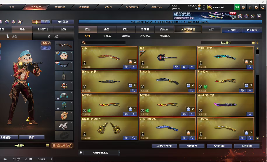 4防隼,荆棘,玄豹 ,神威莲华,神威天棱,3炽芒蝶刃,六烈龙蝴蝶,八面玲珑,白虎音效卡,弹夹齐全