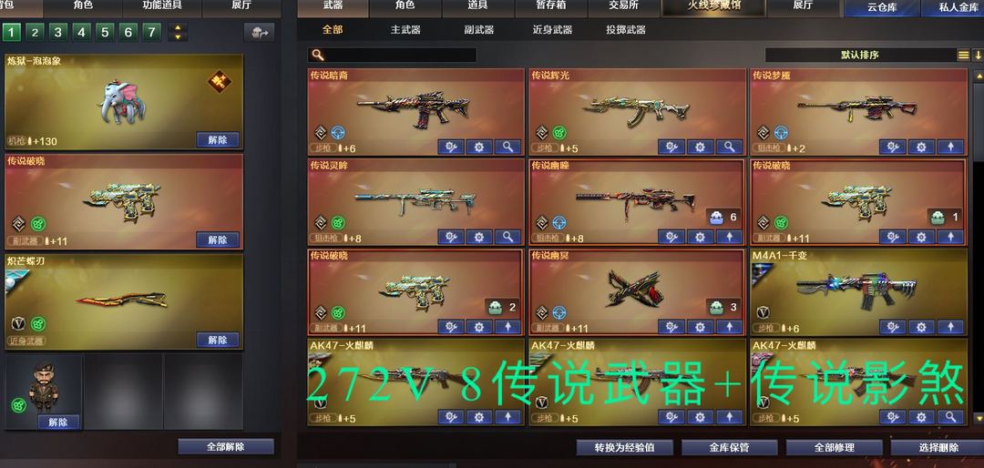 272V传说影煞—炼狱-泡泡象/炽芒蝶刃x3八面玲珑6烈6盘爆破全装传说幽瞳传说灵眸G36C幻影天戎