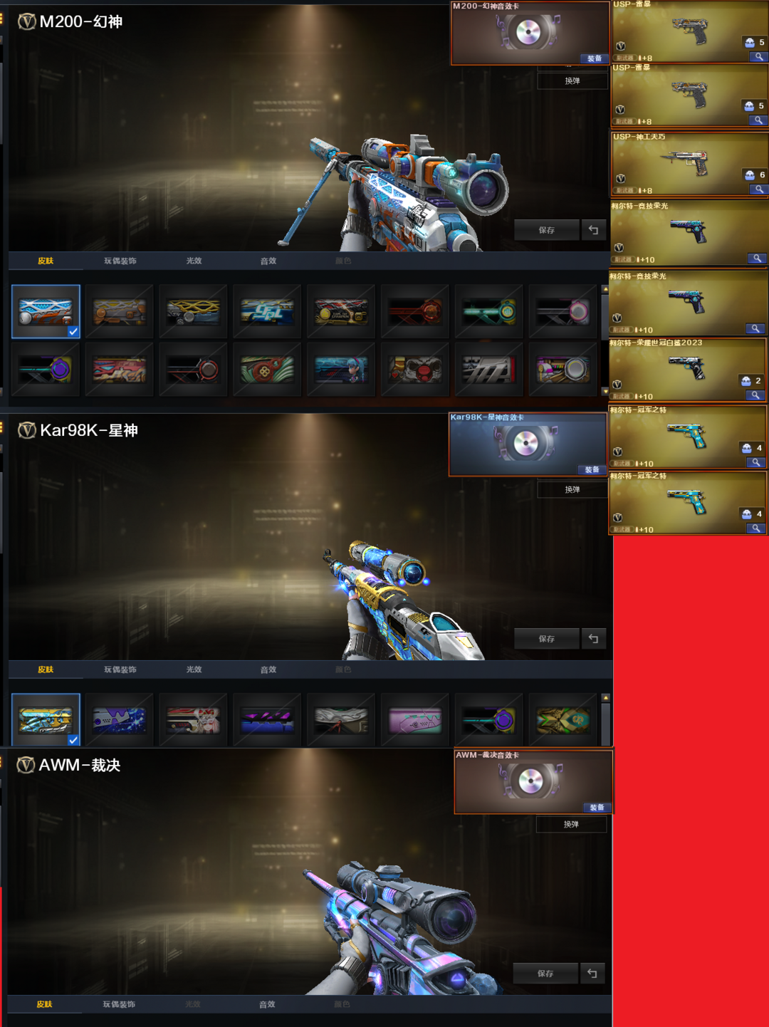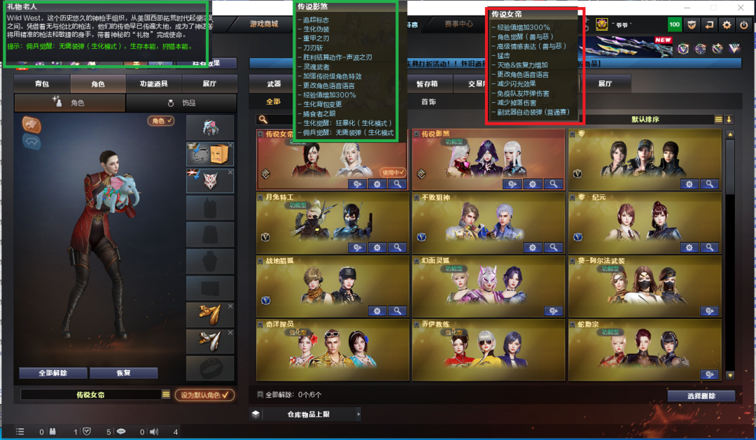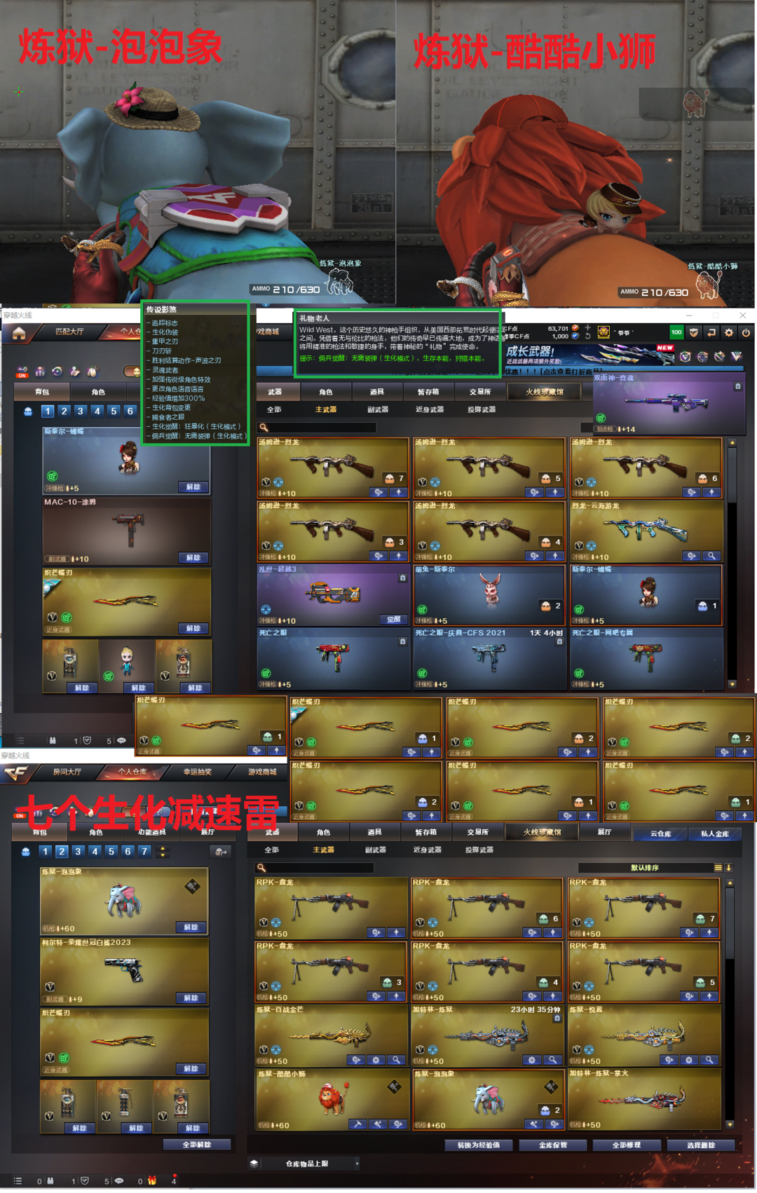 装备描述:排位:可以-----------------生化四防全装(生化变更背包、看僵尸血量):无需换弹、6烈龙、6盘龙、炼狱-泡泡象、炼狱-酷酷小狮、斯太尔蝴蝶、斯太尔萌兔、双面神、死亡之眼、7个炽芒蝶刃、MAC涂鸦、生化减速雷、超级对讲机、、、、、、、、、、爆破四防:幻神音效(星火小队皮肤)、98K星神、、、、2个USP雷暴、UPS神工天巧、2个2柯尔特竞技荣光、23白鲨柯尔特、2个冠军之特、、、、G36幻影、QBZ191-银翼、白虎、QBZ金色蔷薇、、、、幻神音效、裁决音效、星神音效、白虎音效、蔷薇音效、炼狱音效、黑骑士音效、、、、、生化四防(传说影煞、礼物老人)、爆破四防(传说女帝)
