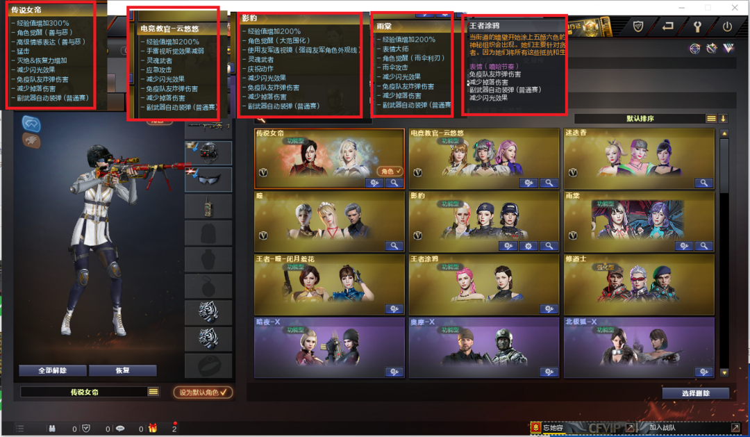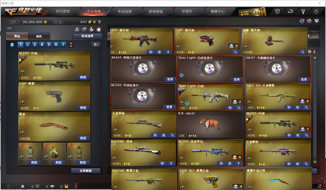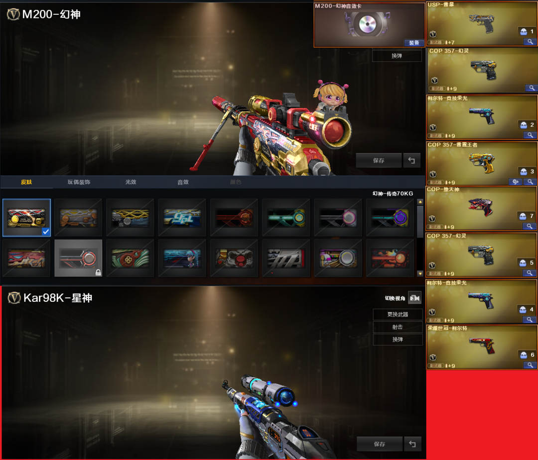 装备描述:排位:可以、、、、、爆破四防:幻神音效(AG皮肤)、星神、M200-竞技荣光、USP雷暴、2个COP幻灵、2个柯尔特竞技荣光、COP雷霆王者、COP堕天神、柯尔特世冠、白虎、王者星神、王者蔷薇、王者火魄、王者冰魄、王者雷怒、牛牛AK、、、幻神音效、白虎音效、火麒麟音效、黑骑士音效、、、3套堕天神、3套夜魔、4套幻灵、5套竞技荣光、1套雷霆王者、、、爆破四防(云悠悠、传说女帝、影豹、雨棠、王者涂鸦)