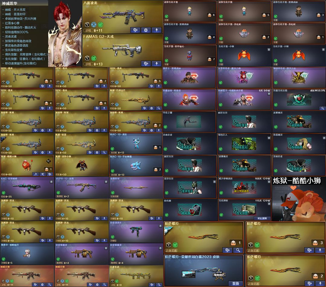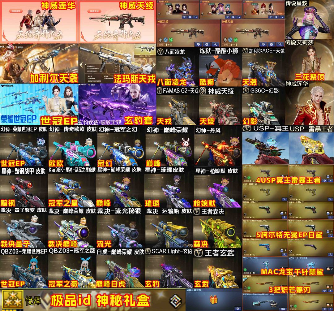 限制: 租号8次及以上 | 撤单率<50%才可租用此帐号装备描述:【装备道具】:神威莲华/传说艾莉莎/传说星骇/神威天绫2把★幻神-荣耀世冠EP/幻神-电流骇客/幻神-传奇欧欧/幻神-冠军之幻/幻神-巅峰荣耀/幻神-丹凤/星神-黯钢战甲/星神-巅峰荣耀/Kar98K-星神-冠军之星/星神-枪娘默/星神-璀璨/梅雀衔霜毁灭-玩具王国雷神/裁决-量子聚变/裁决-运输船/裁决-流光秘银/裁决-巅峰荣耀/白虎-巅峰荣耀/QBZ03-荣耀世冠EP/QBZ03-冠军之薇/3把炽芒蝶刃-荣耀世冠白鲨2023★加利尔ACE-天袭/FAMAS G2-天戎/八面凌龙/SCAR-玄豹/G36C-幻影/VSK-94-金蚀/炼狱-百战金芒/柯尔特-无冕之王/USP-冥王/柯尔特-荣耀世冠EP/Anaconda-玄豹/柯尔特-荣耀世冠白鲨2023/王者玄武/USP-雷暴王者(2)/王者冰锋★幻神音效卡/星神音效卡/金色蔷薇音效卡/白虎音效卡/幻影音效卡/裁决音效卡炼狱★玄豹套装★幻神-枪娘爱丽丝/炼狱-酷酷小狮/炼狱-迷你小钢/斯泰尔-枪娘暗刃/MAC-10-龙宝/MAC-10-千针棘鲨/王者森决/关小雨/隼/机械姬/荆棘/妮妮/玄豹