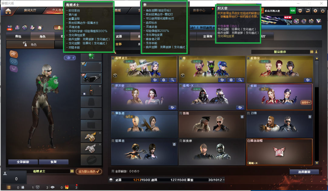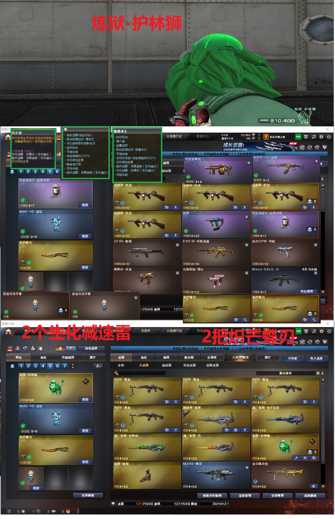 装备描述:排位:可以、、、、、、、、、生化四防全装(可以变更背包、查看僵尸血量):无需换弹:4烈龙、4盘、炼狱、炼狱-护林狮、异变清道夫-小人枪、毒蜂、VPER-12宙斯、异变镇魔者、MAC-龙宝、2把炽芒蝶刃、2个生化减速雷、超级对讲机、全部弹匣、、、、、、、、、爆破全装:G36幻影、传说夜影、QBZ独角-III、、、2套玄豹、、、生化四防(毒蝰术士、隼、炽天使)