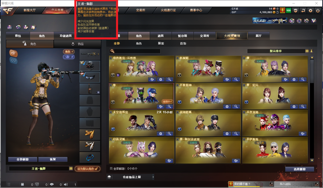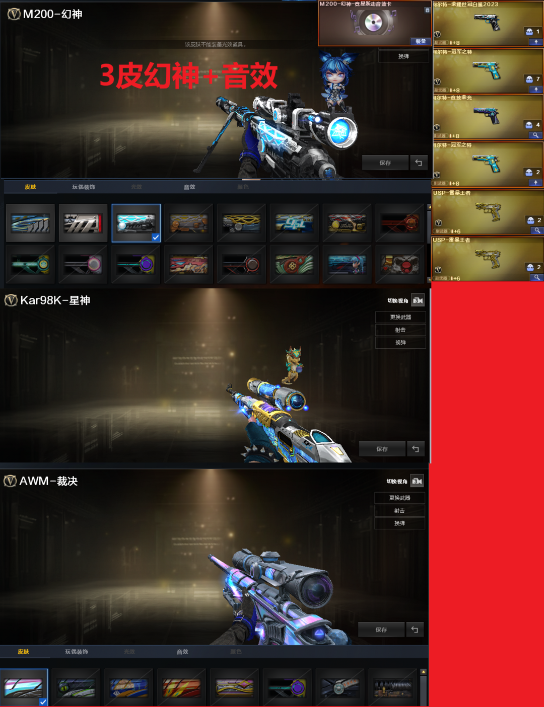 装备描述:排位;可以------------------爆破四防:幻神3皮+音效(23白鲨、星耀、电流骇客皮肤)、98K星神、王者风神、M200-竞技荣光、、、、2个USP雷暴王者、2个冠军之特、23白鲨柯尔特、柯尔特竞技荣光、、、、G36幻影、加利尔ACE天袭、FAMAS G2-天戎、白虎、马枪、金色蔷薇、炽芒蝶刃、、、幻神音效、白虎音效、雷神音效、、、7套竞技荣光、、、爆破四防(王者魅影、云悠悠、隼、机械姬)