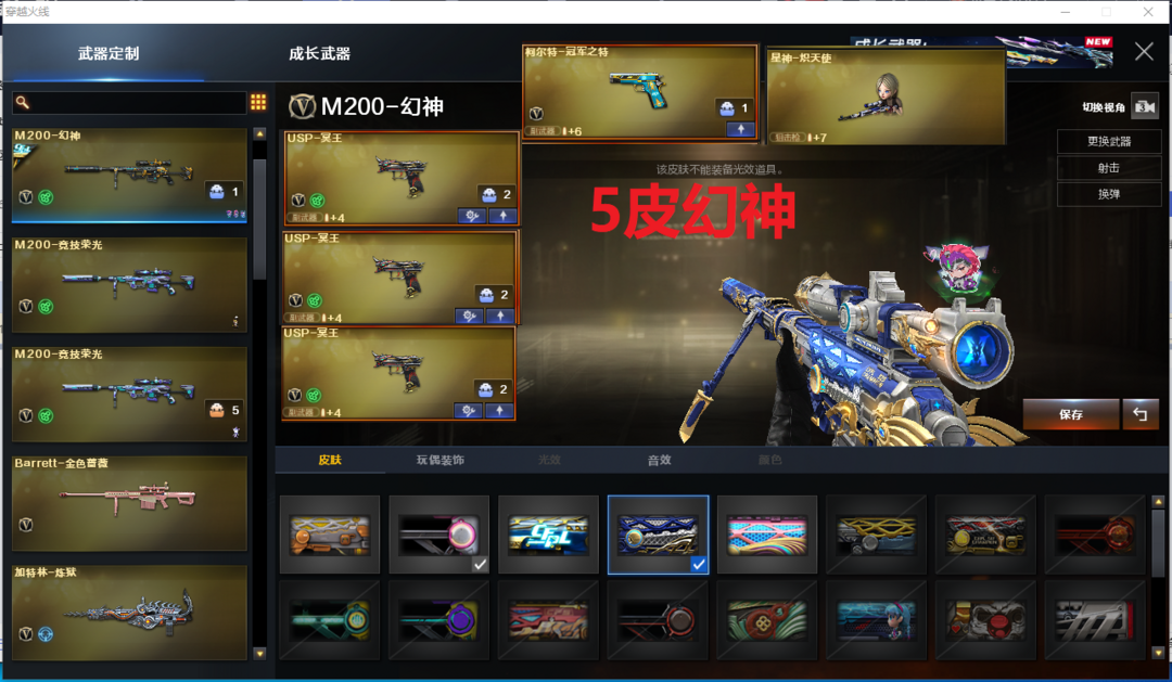 装备描述:排位:可以、、、、、、、、、爆破四防:5皮幻神(KZ冠军、权、冠军之幻、宠儿、黄忠皮肤)、M200-竞技荣光、星神-小人枪、、、、、3个USP冥王、冠军之特、白虎、QBZ冠军之薇、、、1套幻灵、4套竞技荣光、2套雷暴王者、、、爆破四防(晴雅、云悠悠)