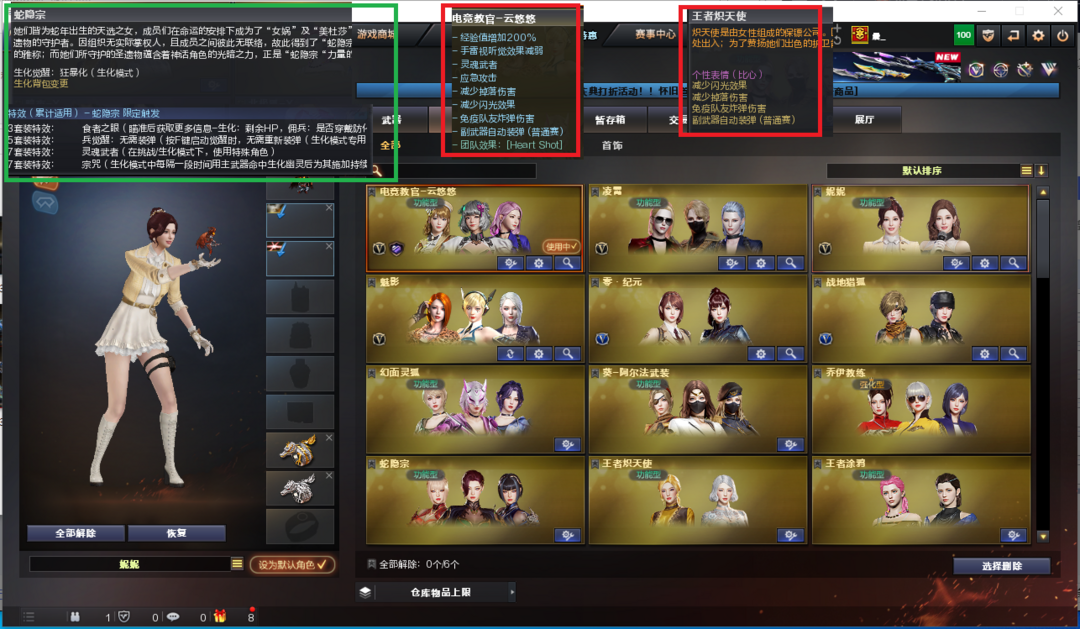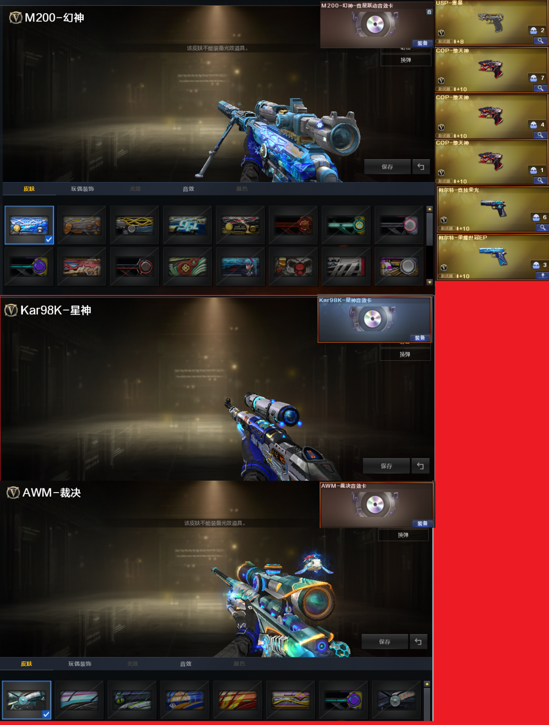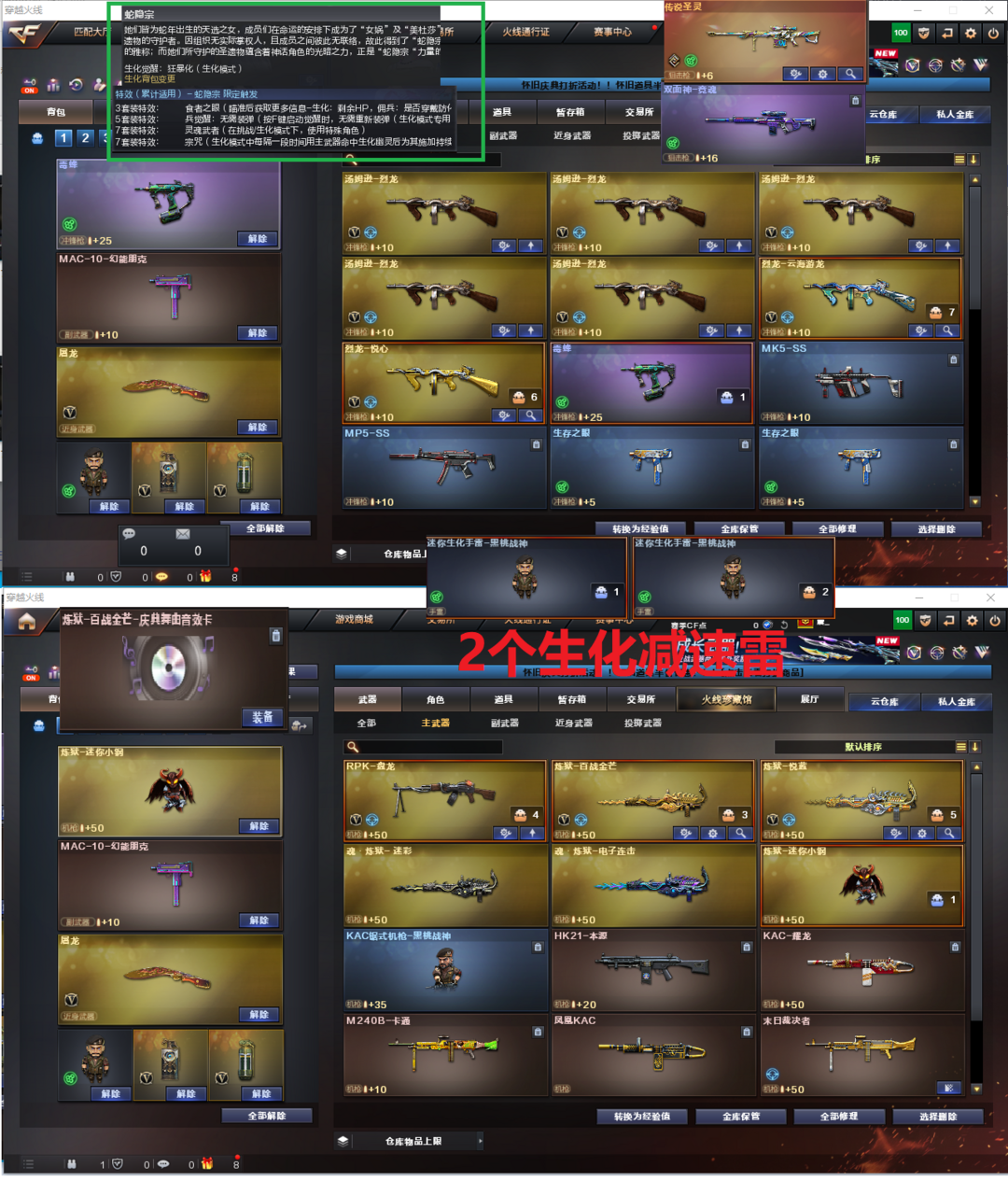 装备描述:排位:可以---------------生化四防全装(更换背包、可以查看生化僵尸血量):无需换弹、6烈、盘龙、传说圣灵、2炼狱+音效、炼狱小钢、毒蜂、斯死亡之眼、MAC-涂鸦、2个生化减速雷、超级对讲机、全部弹匣、、、、、、、、、爆破四防:幻神音效(EP荣耀皮肤)、M200-竞技荣光、98K星神、、、、USP雷暴、3个COP堕天神、柯尔特竞技荣光、EP荣耀柯尔特、、、、、G36幻影、传说光耀、白虎、QBZ金色蔷薇、白虎之魄、、、幻神音效、裁决音效、星神音效、蔷薇音效、白虎音效、毁灭音效、雷神音效、火麒麟音效、黑骑士音效、、、1套雷暴、7套夜魔、4套电竞装甲、1套神工天巧、、、生化四防(蛇隐宗)、爆破四防(云悠悠、妮妮、王者炽天使、职业经理)