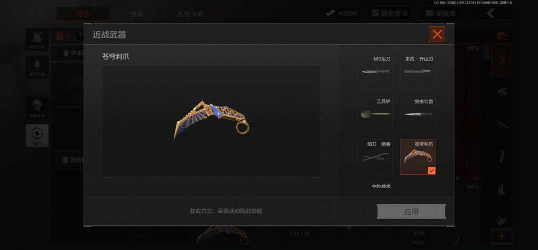 巴斯特+长夜15金皮+70紫皮,战术+伦琴FAL4刀皮,苍穹利爪+空腔匕首+明刀·绣春+突击匕首