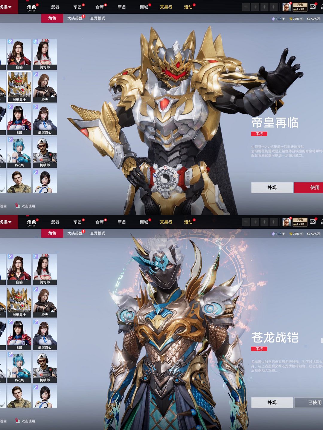 装备描述:【苍龙战铠➕帝皇再临】 七转盘➕全军备枪满阶、七海、A-soul、星瞳➕凌空幻翼、c4显卡、黑白羽翼、短棍唢呐、霓虹蝴蝶。变异芯片齐全!喜欢的朋友可以去无端官服区域看一下❤️如有预约情况+滤泡【Hp230514】 (^_-)点点收藏和好评,谢谢老板。喜欢本账号请点 太收藏 方便下次租用,谢谢光临惠顾