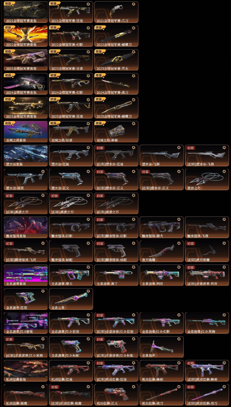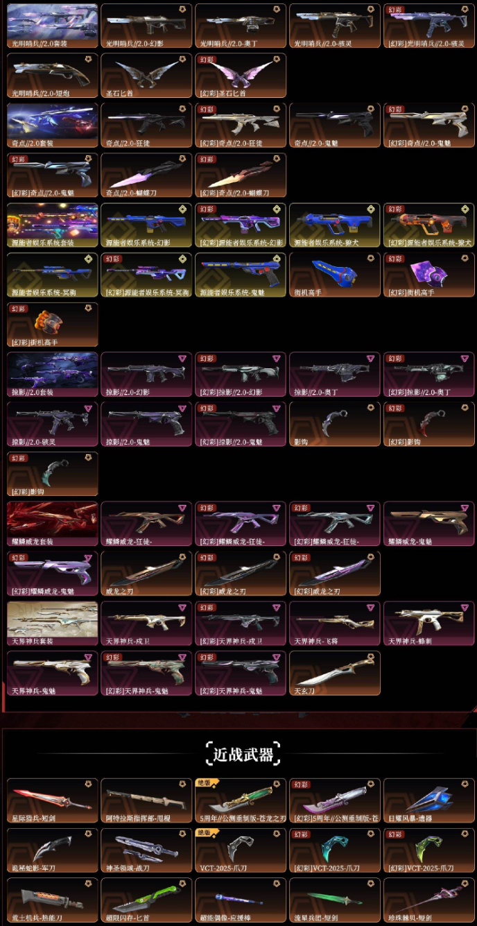 装备描述:颗秒狂徒2025全球冠军掠影2.0套装22冠军苍龙之刃光荣异象狂徒离子狂徒VCT2025爪双城之战狂徒拳套掠影戍卫狂徒奇点2.0黯夜怪谈2024全球冠军混沌序曲狂徒全息波普2.0特效全开*满限定!源能者*光明哨兵*全息波普*全息波普2.0*塑水宗*机动狂飙*天界神兵*耀鳞威龙套装*剥皮小刀*2021全球冠军套装*2023全球冠军套装*离火刃*双城之战正义*堕天遗武狂徒堕天遗武冥驹*威龙之刃*盖亚狂徒