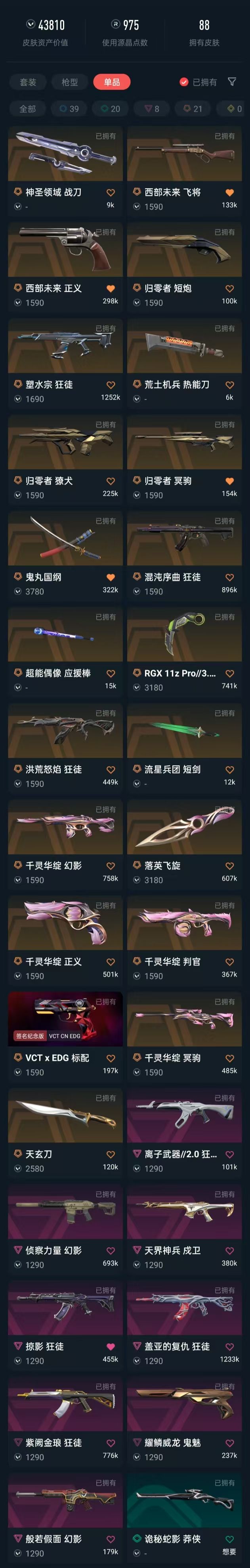 可排✨千灵华绽套✨西部未来✨离子2.0塑水混沌盖亚紫金洪荒掠夺狂徒✨侦察幻影✨显卡爪刀✨VCT标配