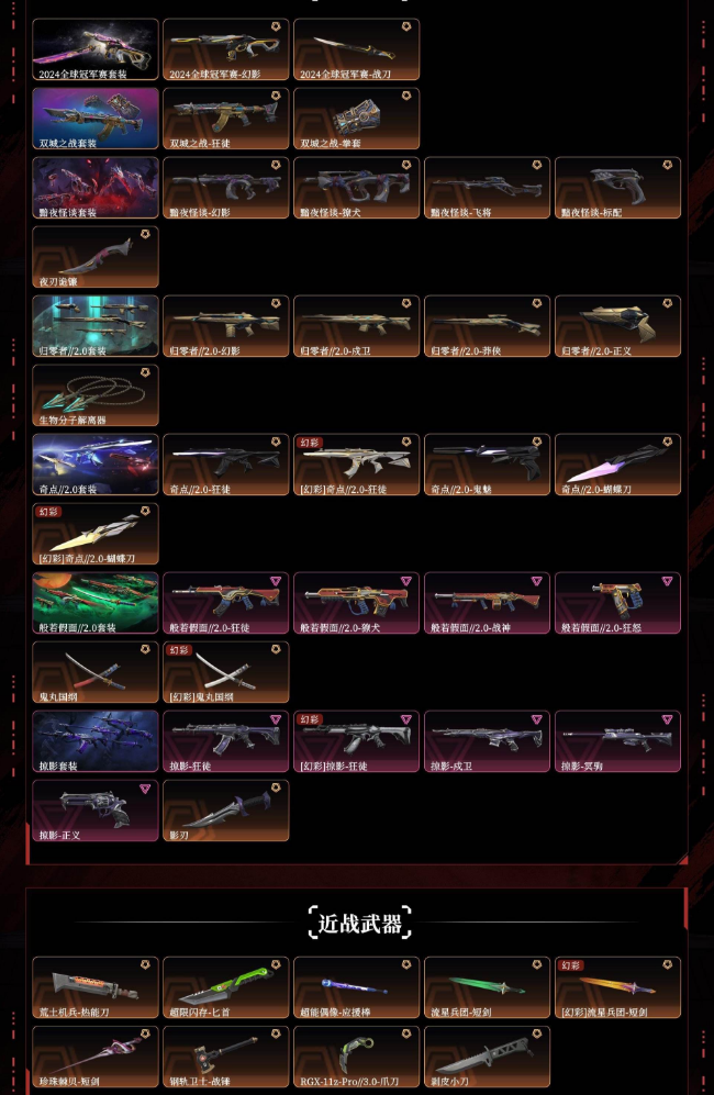 装备描述:2024全球双城之战黯夜怪谈归零者2.0奇点2.0般若假面2.0掠影者超限闪存匕首剥皮小刀显卡3.0爪刀塑水宗狂徒归零者狂徒堕天遗武狂徒天界神兵紫阙金琅狂徒日冕雄狮狂徒起源冥驹vctprx标配vctedg标配塑水宗正义奇点正义天界神兵鬼魅冰点凝结标配
