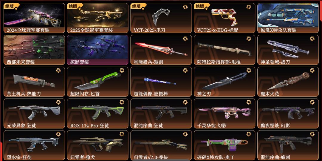 可排位✨10w库存2000R✨24/25冠军/VCT爪刀✨滋滋/西部/掠影套装✨魔术火花/神之刃✨异