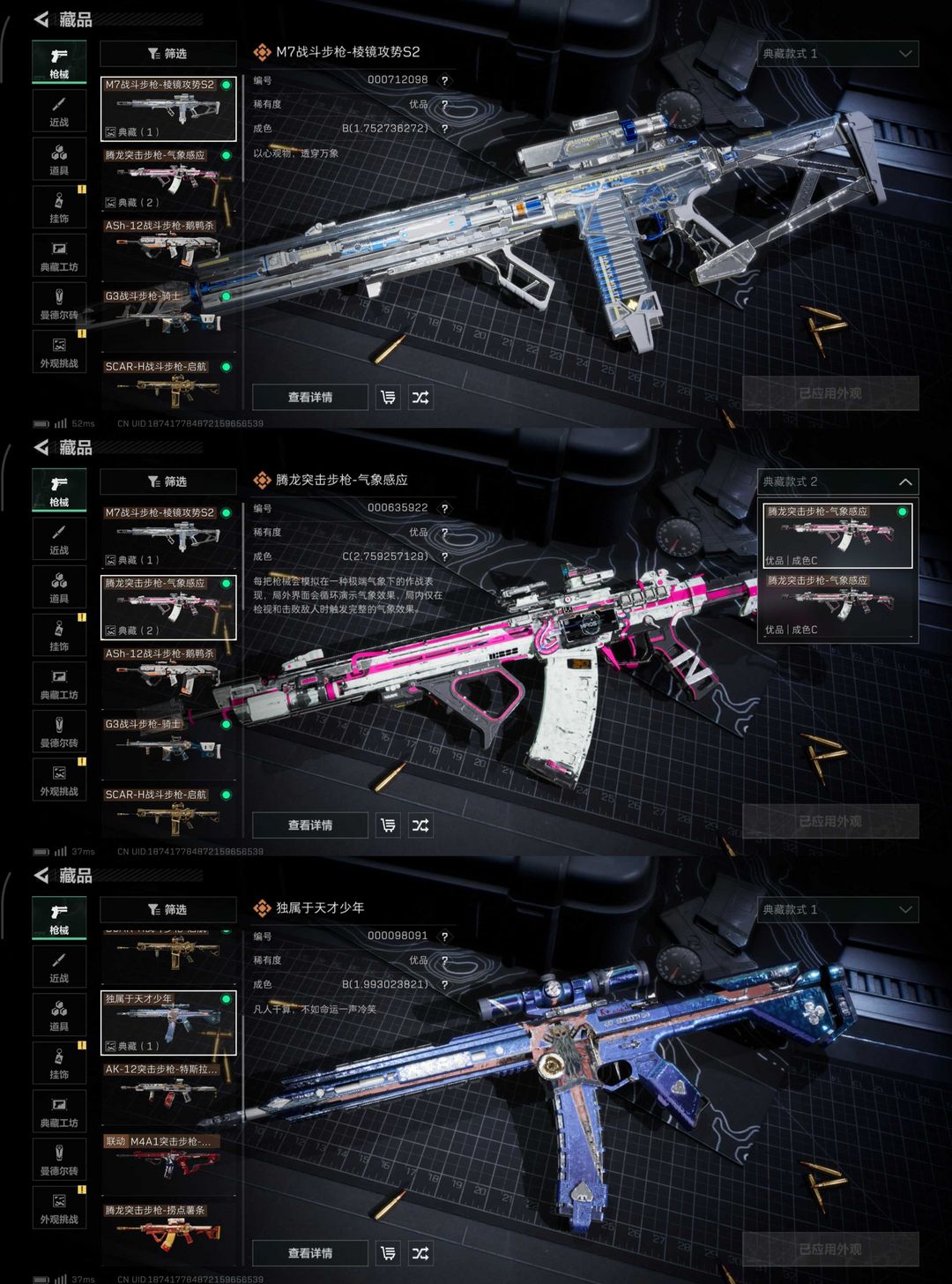 皮肤号 满体满负3*3✨m7暗金棱镜✨气象粉雷冰腾龙✨4红皮✨送刘涛aw✨已备案开g必起诉