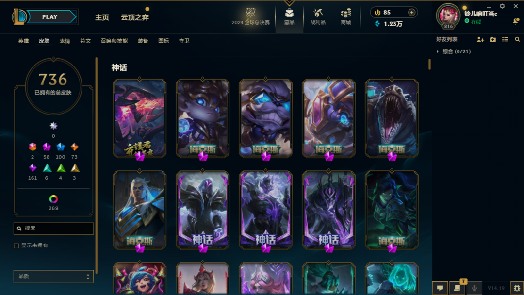 ██ 全英雄 1400皮丨60神话丨可排位丨金卡莎丨冰雪皎月丨鼠年瑟提丨莲华永恩锤石丨神龙李青亚索