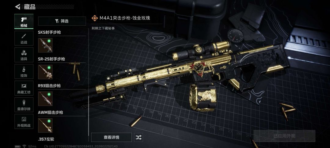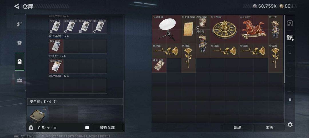 装备描述:仓库82.4m,纯币60759k。 红皮维什戴尔,枪红皮13个,有aw红皮 六头两个,六甲一个,六包一个 有张九格体验卡 藏品箱和里面的都不能买,卡可以用不能卖