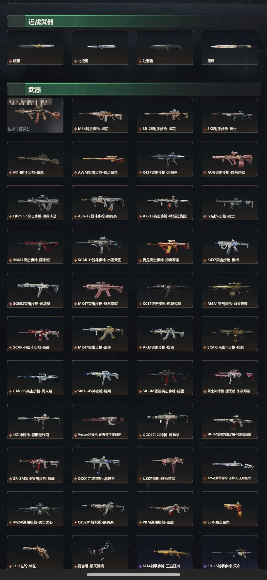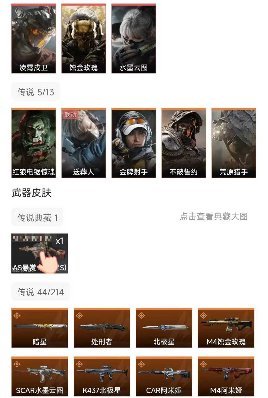 皮肤号 as典藏暗星北极星凌霄戍卫,蚀金玫瑰,维什戴尔,44款传说枪皮肤