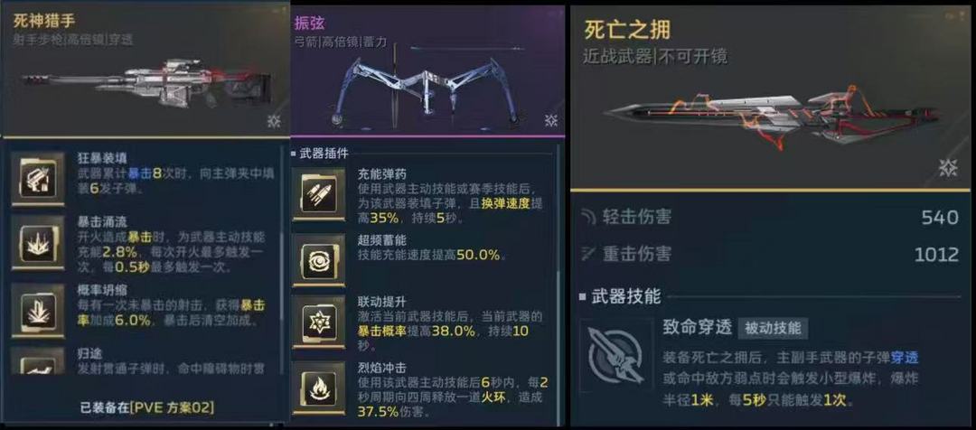 装备描述:1号金插件】:快速装填,战术装填,危机装填,猎杀装填,长跑冠军,充能弹药,狂暴装填,研灭速装,极限载弹,弱点续弹,超载弹厘,超载弹,超载弹匾,帽子戏法,超导补给,充能链路,致命循环,蚀煜装填,蚀焗装填,蚀化速装,解构装填,同调稳持,协同供弹,闪回装填,余震速装,导弹装填;【2号金插件】:闪身,精确能量,火力回转,危机充能,猎杀充能,随时待命,并发充能,多重激返,弱点供能,出其不意,回响续装,川流不息,真空回涌,暴击涌流,层积涌流,崩解回涌,虹吸充能,迁跃回路,导弹供能,超频蓄能;【3号金插件】:幸运装填,联动提升,锚定攻击,递进膛压,协频共振,近距增幅,钝化增伤,精密追击,渐入佳境,攻守自如,链式反应,协防阵列,弹容共振,过载膛压,溉率珊缩,成决充能,裁决充能,层积强袭,重装弹头,强击火力,终爲序列,终焉序列,相位强袭,致命导弹,技能增涌;【4号金插件】:烈焰冲击,电环疾驰,亲密距离,杀戮连锁,龙炎推进,聚能弹药,聚能速度,爆破校调,技能扩散,穿甲扩散,弹跳风暴,剧毒速装,闪电轰击,归途,反哺,容反哺,腐蚀榴弹,空腐蚀榴弹,空威慢环爆,珊缩奇点,缩奇点,衰变连锁,层积裂变,追猎齐