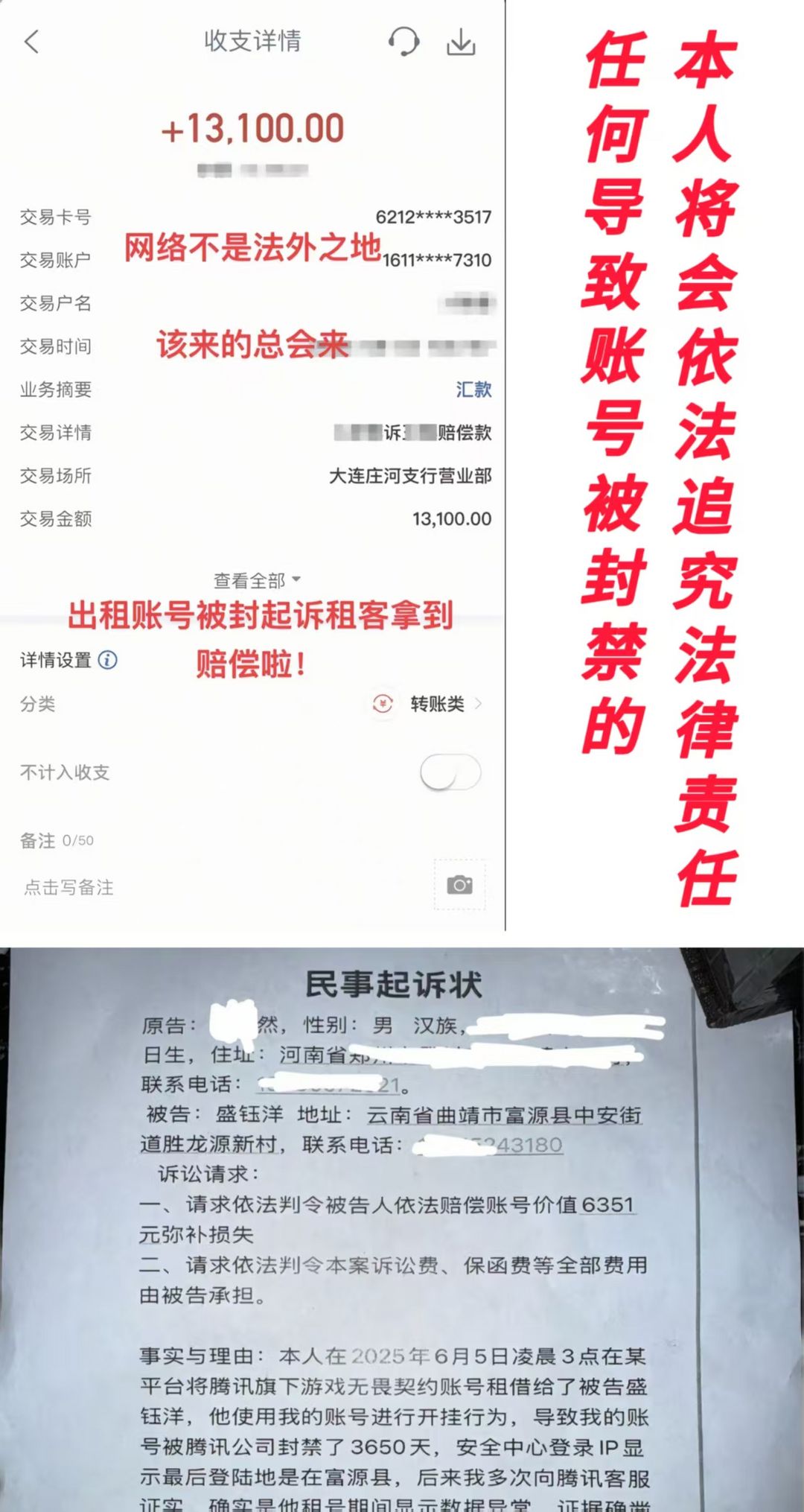 限制: 撤单率<15%才可租用此帐号装备描述:⚠️租客有异常游戏行为,号主将会顶号应急处理。 ⚠️禁止使用鼠标、键盘、手柄。 ⚠️因为排位炸鱼,被封号的,扣除押金。 ⚠️因为违反游戏规定被封的,将依法追究责任。 ⚠️封十年的,照价赔偿。(已经有相关法律) ⚠️不要抱侥幸心理,不要觉得无所谓,现在科技那么发达,追究你的责任是很简单的。