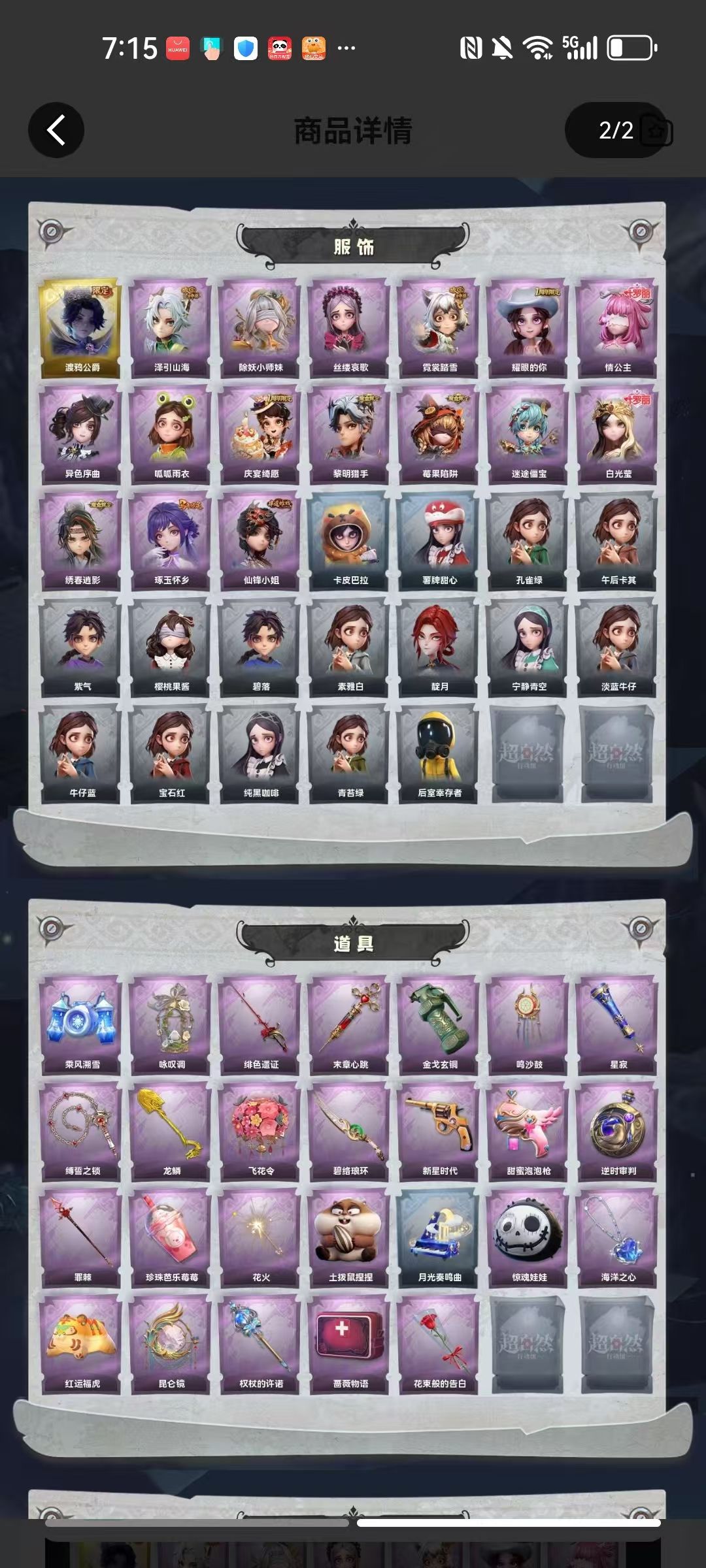 装备描述:皮肤:零-渡鸦公爵,逍遥-泽引山海,莉莉-除妖小师妹,爱丽丝-丝缕哀歌,小黄-霓裳踏雪,爱丽丝-耀眼的你,莉莉-情公主,小黄-异色序曲,小黄-呱呱雨衣,阿念-庆宴绮愿,艾伦-黎明猎手,莉莉-莓果陷阱,阿念-迷途僵宝,薇薇安-白光莹,逍遥-绣春逍影,巫铃儿-琢玉怀乡,薇薇安-仙锋小姐;道具:喷气背包-乘风溯雪,音响-咏叹调,桃木剑-绯色遗证,急救包-末章心跳,闪光弹-金戈玄铜,音响-鸣沙鼓,专业手电-星寂,长鞭-缚誓之锁,铲子-龙鳞,额外的背包-飞花令,刺刀-碧络琅环,转轮手枪-新星时代,电击枪-甜蜜泡泡枪,传送按钮-逆时审判,长枪-罪棘,黄牛能量饮料-珍珠芭乐莓莓,荧光棒-花火-荧光棒-花火,急救包-土拨鼠捏捏,音响-月光奏鸣曲,腰包-惊魂娃娃,摸金符-海洋之心,腰包-红运福虎,传送按钮-昆仑镜,电击枪-权杖的许诺,急救包-蔷薇物语,专业手电-花束般的告白;饰品:头饰-大葱明头套,头饰-面具马头套,头饰-小财神豚豚头套,头饰-小狗蛇点点头套,头饰-樱桃奶油布丁,头饰-炙热烧烤,头饰-太空鲨头套,头饰-蒜了八,头饰-萨卡班甲鱼头套,头饰-雪墩墩头套,头饰-滑稽头套