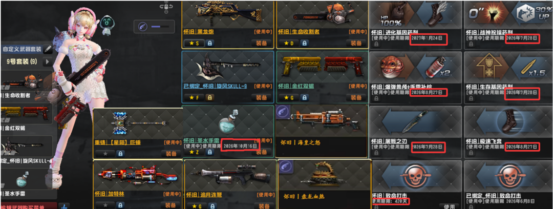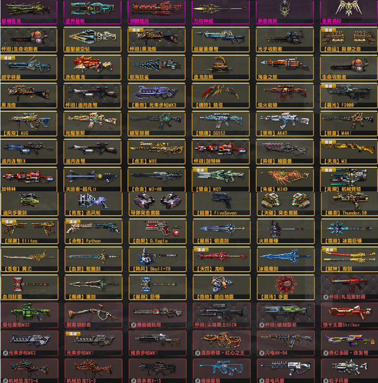 龙腾屿●夙夜狼契万钧神威龙神●重铸星陨巨锤●光束套●怀旧套盘龙炮海皇电锯●闪电天巡11到21赛季去雾