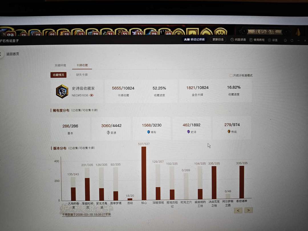 卡牌收藏进度52%,角色金色形象多,主要是娱乐用,天梯估计太高不太好打。