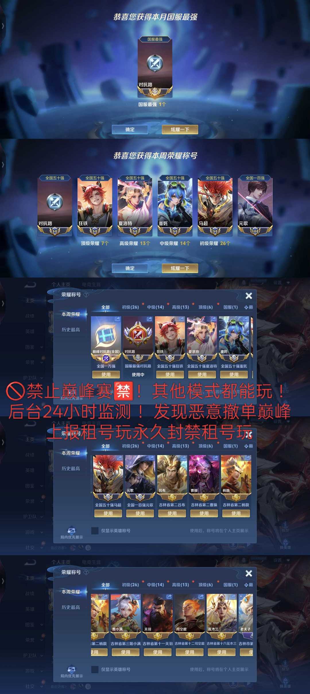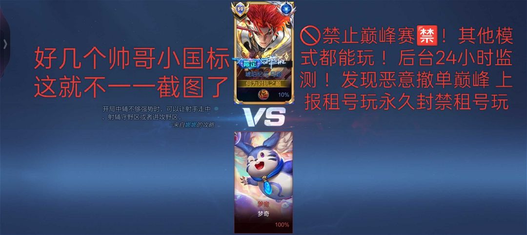 限制: 租号3次及以上 | 撤单率<65%才可租用此帐号装备描述:店铺内大多数号均可低价包天喔 本周截图❤️ 恶意挂机撤单永久拉黑平台记录 禁止巅峰赛● ★开挂美化包等违规第三方软件导致封号将会平台申诉封其租号玩账号并追究其法律责任 ★恶意撤秒改密码顶号拉黑并申诉追回租金 喜欢此账号租号玩平台直接租赁即可 ●以下违规情况扣除保证金①该账号禁止改名 ②违规导致扣信誉积分③非法发言导致账号禁言④聊天记录出现诈骗记录⑤禁止巅峰赛 打巅峰拉黑 租号玩管理员将24小时通过后台监控!