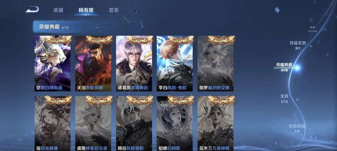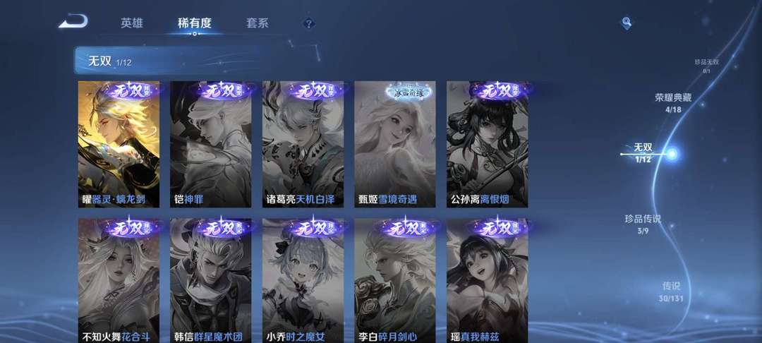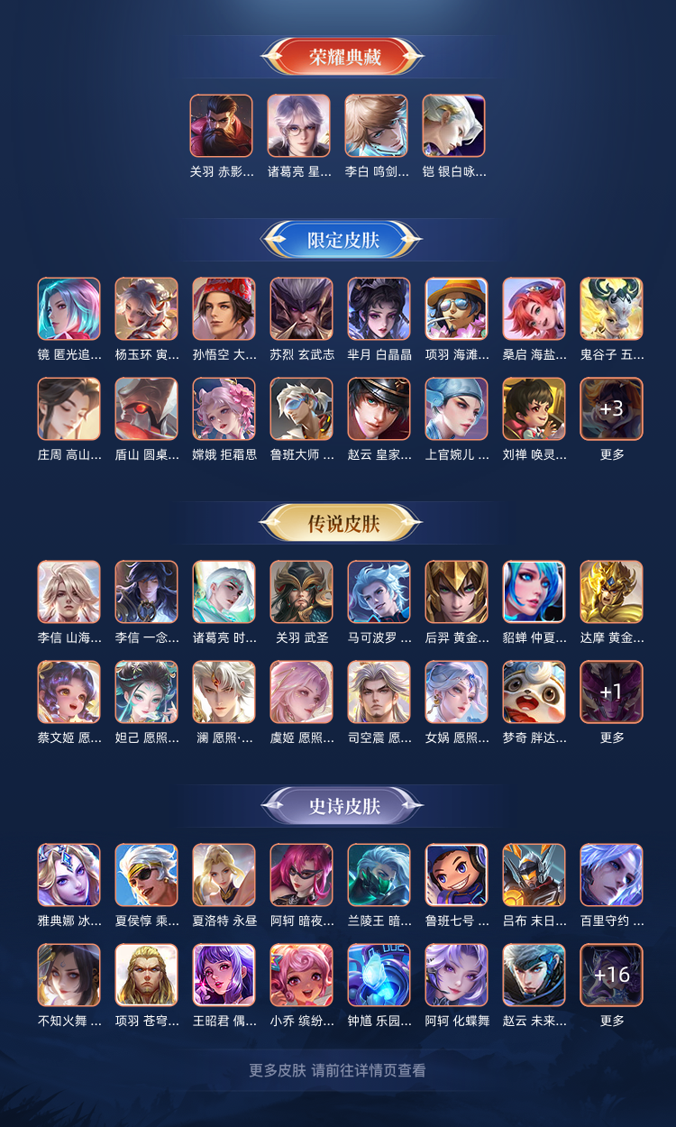 4款典藏皮肤,多款传说限定皮肤,有耀的无双皮,英雄除了武则天都有,可打排位