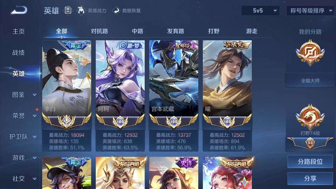 3月在榜小国标宫本武藏⭐1.8w历史大国标李白⭐514皮v10可共享⭐巅峰万强巅峰闪电框⭐74段打野