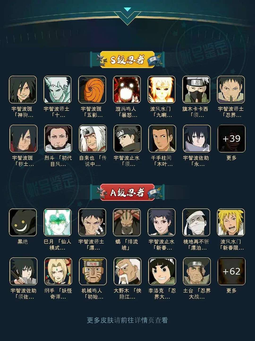装备描述:52S 75A 356忍者宇智波止水「新春限定」/桃地再不斩「漂泊武 士」/蝎「绯流琥」/黑绝/波风水门「新春限定」/巳月「仙人模 式」/宇智波带土「漂泊浪客」/烈斗「初代目风影」/神秘面具男 「红夜之刃」/宇智波斑「秽土转生·解」/自来也「传说中的三 忍」/宇智波带土「十尾人柱力」/波风水门「秽土转生」/千手柱 间「木叶创立」/宇智波止水「须佐能乎」/漩涡鸣人「九喇嘛连 结」/漩涡鸣人「暴怒·第六尾」/宇智波斑「五影会谈」/宇智波 斑「白面具」/宇智波斑「神驹佑将」/宇智波带土「忍界大战」1 宇智波佐助「永恒万花筒」/佩恩·天道「超」/旗木卡卡西「须佐 能乎」/波风水门「九喇嘛连结」