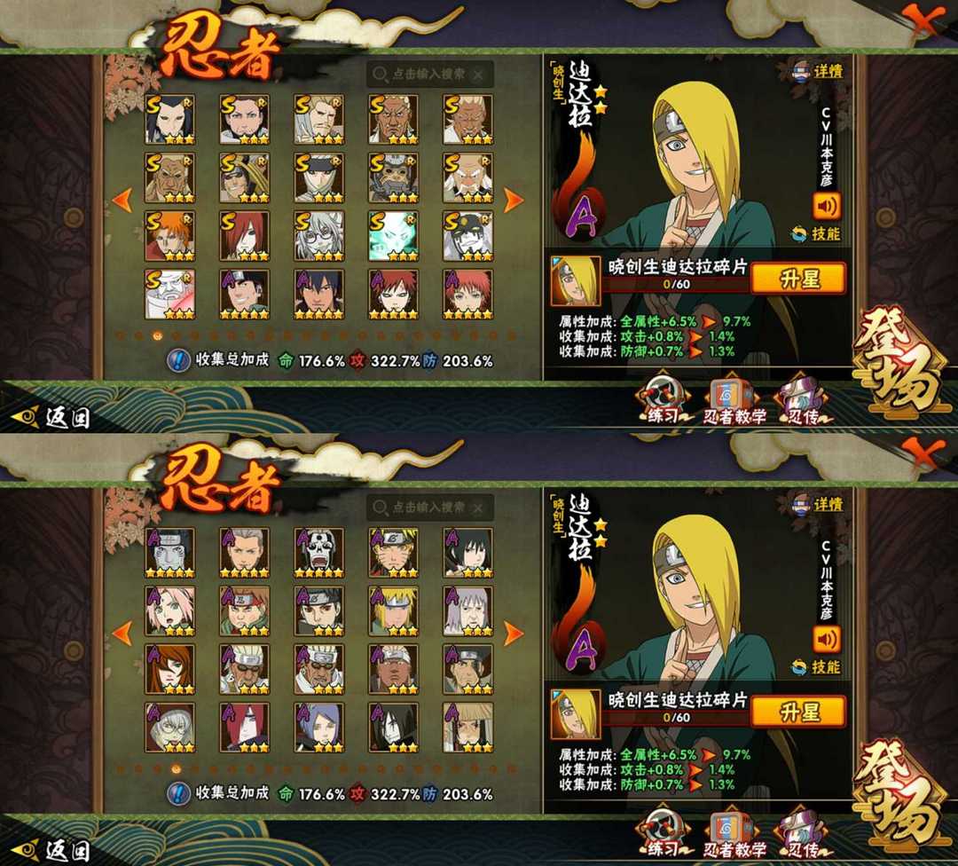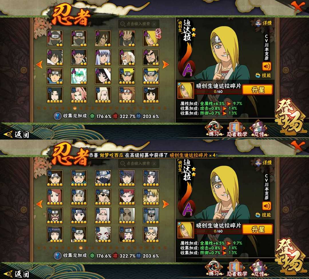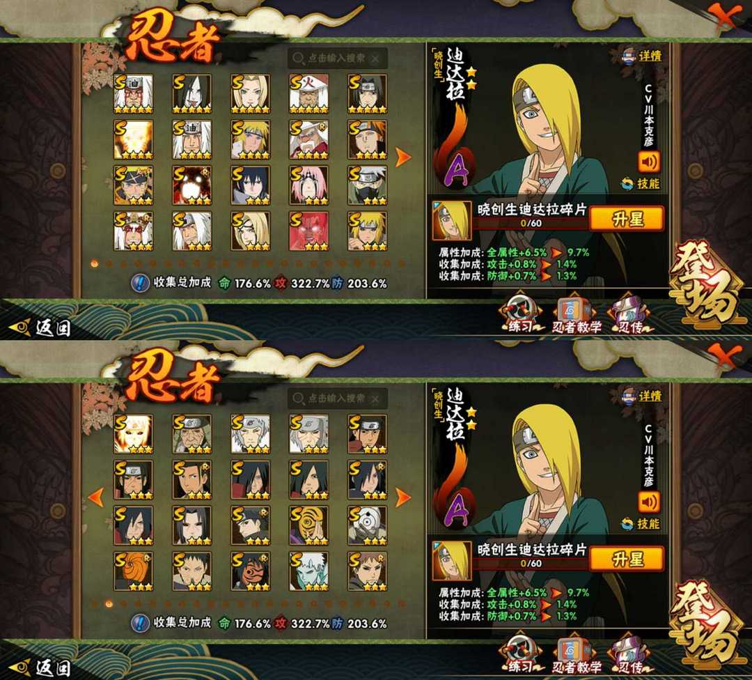 装备描述:239区,别登陆别的区 3400万战力,390万攻击 点券通灵,二尾蓝猫,熊猫,螃蟹 高招忍者会在第一天招募出来 点券忍者: 鸡翅佐助,暴怒带土,漂泊带土,漂泊小南,漂泊六道佩恩,漂泊武士扉间,漂泊武士再不斩,侠隐江湖纲手,侠隐江湖照美冥,新春水门,新春止水,三船,勘九郎忍界大战,