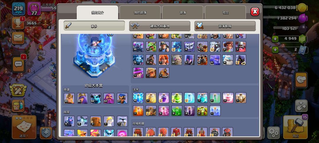 部落冲突17本,17本满防满兵种,满药水,暗世界满级兵种