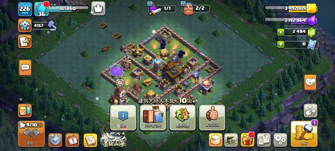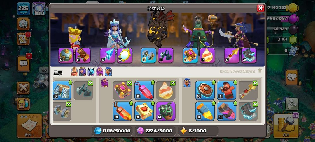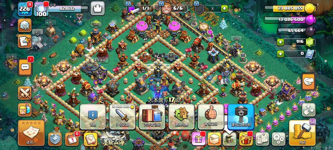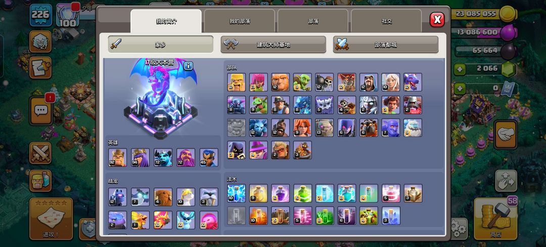 17本初期,有一段时间没玩了,建筑物等级还不太高,拿来捐兵还行 四王等级60~90级 。